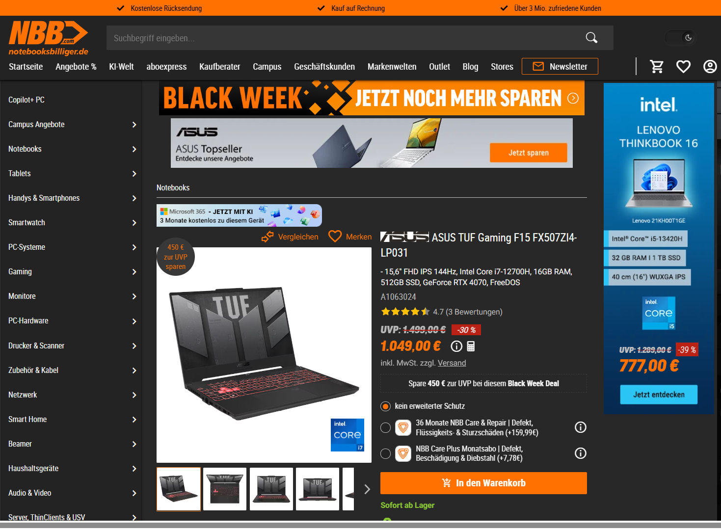 Die „TUF“-Reihe (The Ultimate Force) der Firma Asus steht für Gaming-Notebooks des unteren bis mittleren Preissegments. Aktuell führt Notebooksbilliger.de mit dem TUF Gaming F15 FX507ZI4-LP031 ein 15,6-Zoll-Modell der Serie zu einem Angebotspreis von 1.049 Euro im Sortiment. Ein leistungsschwächeres Schwestermodell musste sich bereits einem Test stellen und ergatterte dabei die Endwertung „Gut (87 %)“.