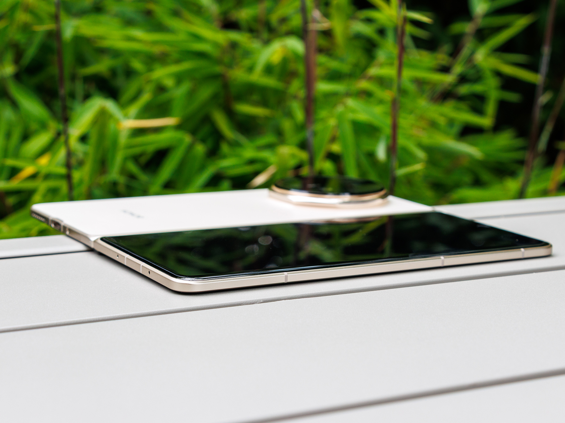 Das Honor Magic V5 ist nominell das dünnste faltbare Telefon, welches zum Zeitpunkt des Tests erworben werden kann. Zumindest, wenn die Farbvariante Elfenbeinweiß gewählt wird, welche auch unser Testgerät ist. Morgengold und Schwarz sind minimal dicker (aufgeklappt: 4,2 mm, geschlossen: 9,0 mm). Die Verarbeitung des V5 gefällt uns sehr gut. Trotz seiner schlanken Bauweise wirkt Foldable stabil und durch eine Karbonverstärkung soll auch das Innendisplay widerstandsfähiger geworden sein.