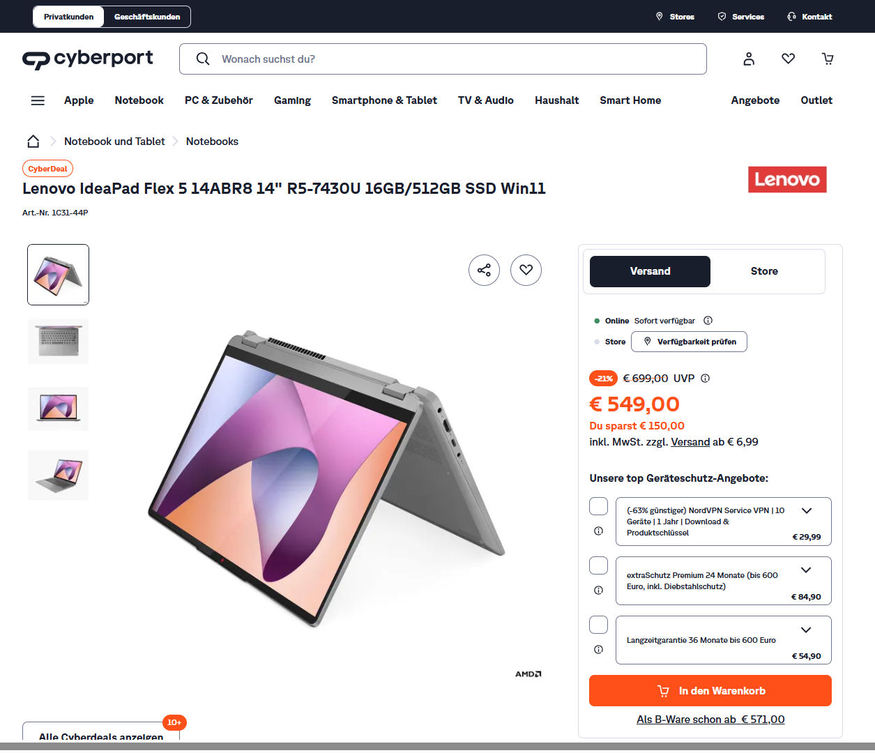 Convertibles gehören zu den vielseitigen Computern: Sie können als klassische Notebooks oder auch als Tablets genutzt werden. Ihre um 360 Grad umklappbaren Displays eröffnen einige Möglichkeiten. Aktuell führt Cyberport mit dem IdeaPad Flex 5 14ABR8 ein 14-Zoll-Convertible aus dem Hause Lenovo zu einem Angebotspreis von 549 Euro im Sortiment. Der Rechner ist bekannt: Das Intel-basierte Schwestermodell (Lenovo IdeaPad Flex 5 14IRU8) musste sich bereits unserem Test stellen und erreichte dabei die Bewertung „Gut (82 %)“.