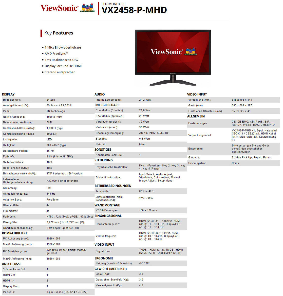 ViewSonic präsentiert mit dem VX2458-P-MHD einen neuen Gaming-Monitor mit 24 Zoll und Full HD-Auflösung (1.920 x 1.080 Pixel). Das neue Modell der VX-Monitor-Serie von ViewSonic verfügt über optimierte Game-Modi, eine Bildwiederholrate von 144 Hz, integrierte 2-Watt-Lautsprecher (2x 2 W) und eine Reaktionszeit von 1ms. Der VX2458-P-MHD ist ab sofort im Handel für 169,90 Euro erhältlich.