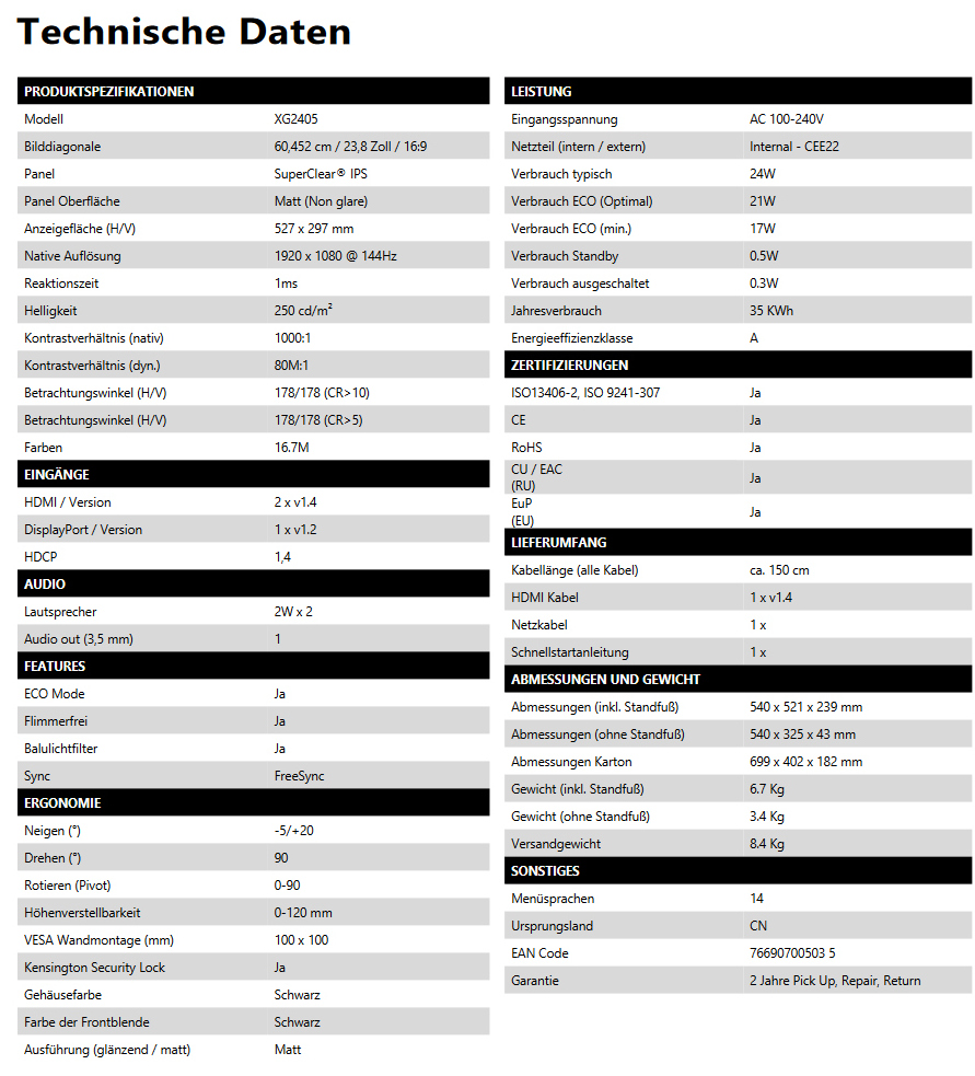 Der Viewsonic XG2405 integriert ein 24 Zoll großes IPS-Panel, unterstützt AMD FreeSync und empfiehlt sich dank einer schnellen Reaktionszeit von 1 ms auch für rasante Actionspiele. Das größere Monitormodell der Serie verfügt als Elite XG2705 über die gleiche Ausstattung bei einer Panelgröße von 27 Zoll.