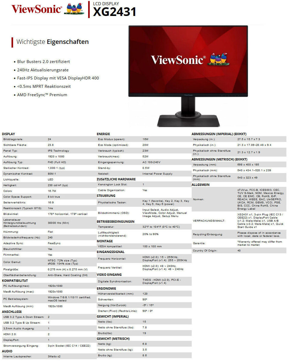 Als weitere Ausstattungsdetails nennt ViewSonic für seinen Gaming-Monitor XG2431 zwei HDMI 2.0-Ports, HDCP 1.4, DisplayPort 1.4, einen integrierten USB-Hub (1x Up, 2x Down USB 3.2, 1x 2,1A / 1x 0,9A), zwei eingebaute 3-Watt-Lautsprecher, Audioausgang (3,5 mm) sowie verschiedene Einstellmodi fürs Gaming, Eco und Blaulichtreduzierung.