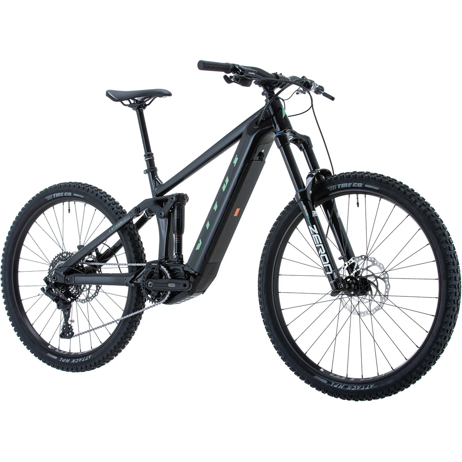 Vorne und hinten kommen Tektro HD-M535-Scheibenbremsen zum Einsatz, die hydraulischen Scheibenbremsen kommen dabei mit 203 Millimeter großen Bremsscheiben. Eine gute Traktion versprechen die VEE Tire-Reifen, wobei es sich beim E-Mythique LT um ein Mullet-Bike handelt - dementsprechend misst das Vorderrad 29 Zoll, das Hinterrad hingegen 27,5 Zoll.