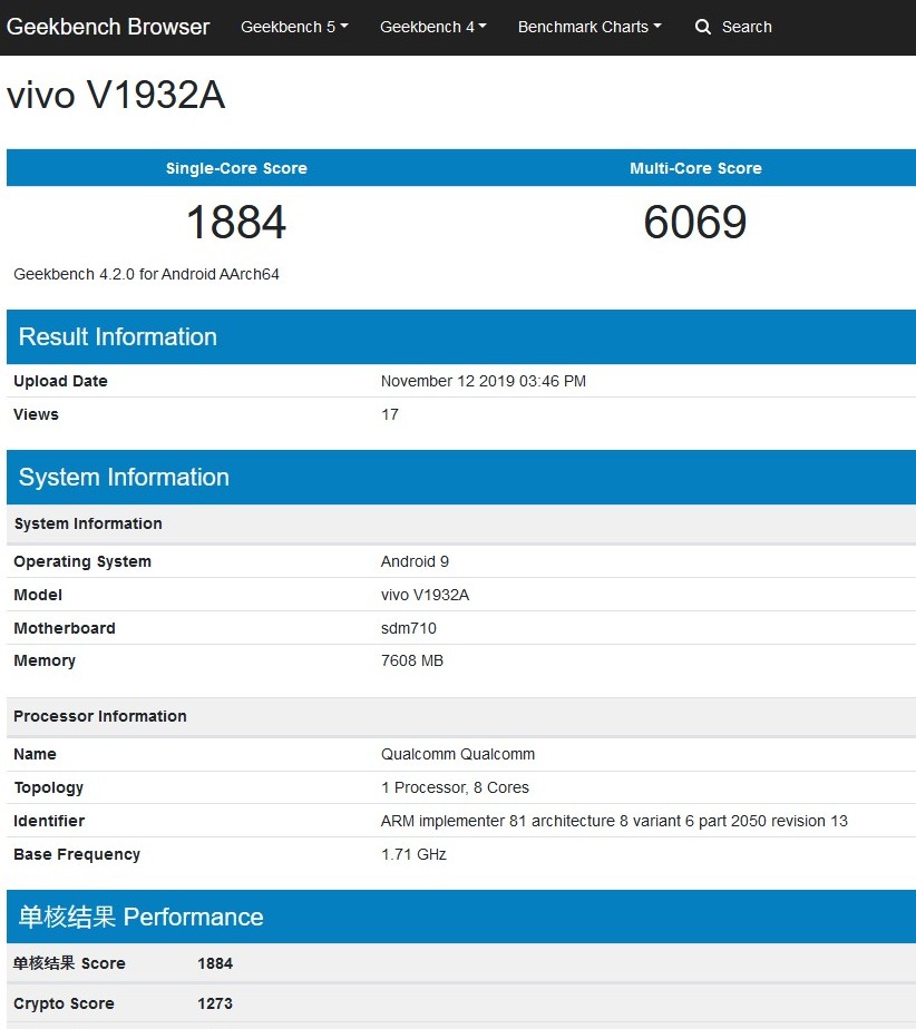 Der Datenbankeintrag von Geekbench für den Arbeitsspeicher mit 8 GByte stimmt allerdings mit den Tenaa-Angaben zu Vivos S5 überein. Im Geekbench erzielt das Vivo V1932A einen Single-Core Score von 1.884 Punkten und einen Multi-Core Score von 6.069 Zählern. Diese Werte entsprechen in etwa der Performance des Xiaomi Mi 9 SE bei uns im Test auf Notebookcheck.com. Das Mi 9 SE schaffte im Geekbench 4.4 entsprechend 1.875 respektive 5.975 Punkte.