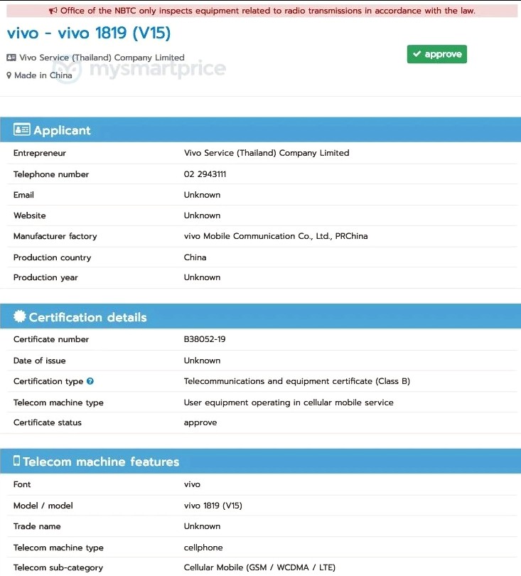 In Thailand wurde nun das Vivo V15 als Modell Vivo 1819 bei der NBTC zertifiziert. Zuvor hatte dort bereits das Vivo V15 Pro die Zertifizierung erhalten. Viele Details verraten die jetzt gesichteten Unterlagen aus Thailand nicht. So bleibt es weiter bei den Spekulationen, dass das jetzt aufgetauchte Vivo V15 die gleiche Pop-up-Selfiekamera mit 32 MP wie die V15-Pro-Variante erhalten wird.