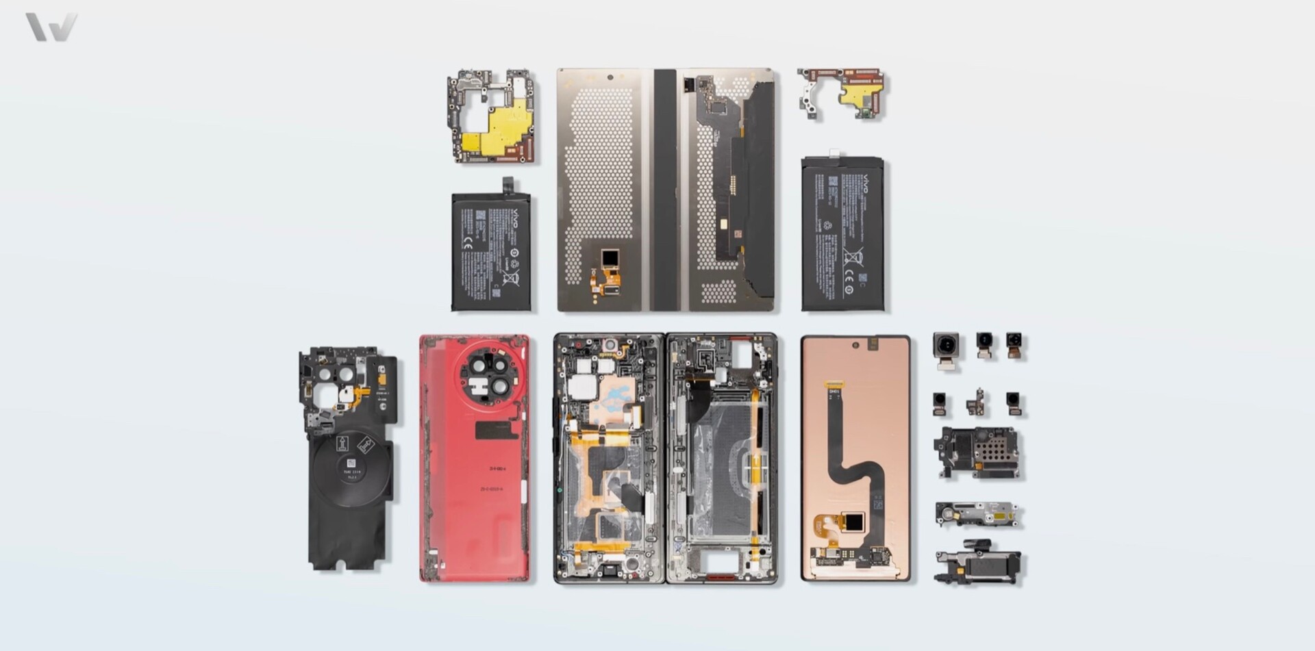 Obwohl das Smartphone mit einer Bauhöhe von gerade einmal 6,0 Millimetern dünner ist als das Samsung Galaxy Z Fold4 5G (ca. 1.490 Euro auf Amazon), macht Vivo keine Kompromisse im Hinblick darauf, wie einfach das Gerät zu reparieren ist. Die Rückseite und das Zweitdisplay werden zwar ins Gehäuse geklebt, sind diese aber erstmal abgenommen, können die meisten Komponenten problemlos ersetzt werden, inklusive der beiden 2.400 mAh fassenden Akkus.