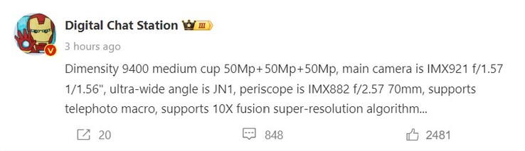 Das mit dem neuen Mediatek Dimensity 9400 Chip bestückte Kamera-Flaggschiff wird eine Triple-50-Megapixel-Kamera bieten, der Hauptsensor basiert laut Digital Chat Station (siehe auch unten) auf einem 1/1.56 Zoll großen Sony IMX921 mit F/1.57 Blende. Hinter dem Ultraweitwinkel steckt der altbekannte Samsung ISOCELL JN1, das neue Periskop-Telefoto ist ein Sony IMX882 mit F/2.57 Blende und nativer 70mm äquivalenter Brennweite. Neben dem neuen 10x Fusion-Zoom-Algorithmus soll das 50 Megapixel Telefoto auch Macro-Aufnahmen unterstützen.