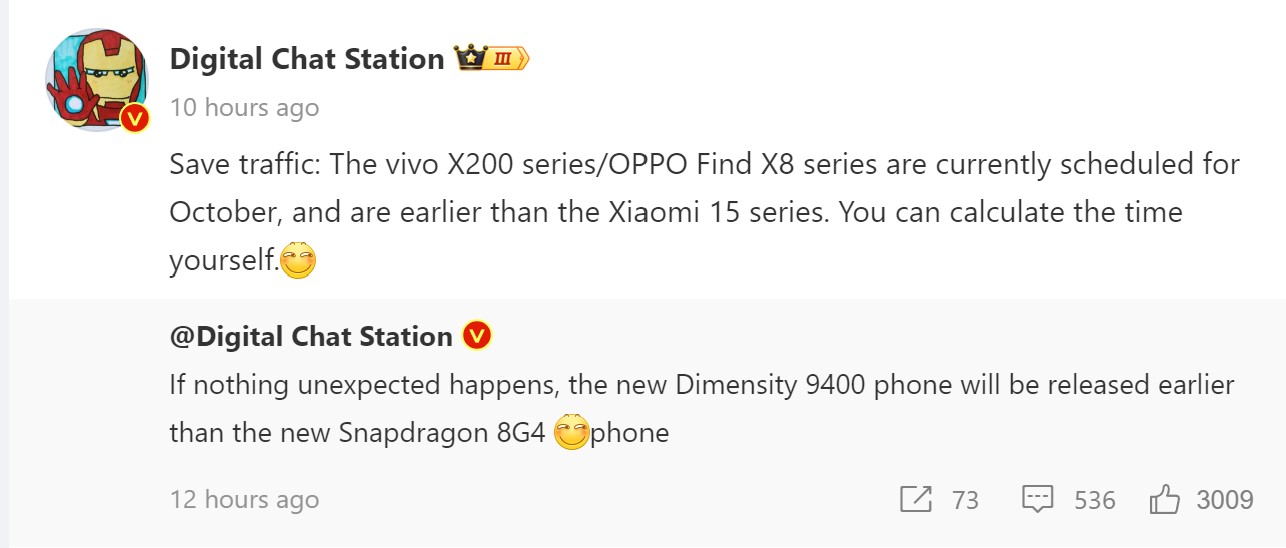 2024 wird das Xiaomi 15 wohl noch etwas früher auf Kundenfang gehen. Qualcomm wird den Snapdragon 8 Gen 4 am 21. Oktober offiziell in Hawaii auf den Weg schicken, kurz danach wird der Xiaomi 15 Launch dann in Peking erwartet, soweit so bekannt. Doch die zunehmend erstarkende Mediatek-Fraktion dürfte 2024 auf der Überholspur sein, wie zumindest der gewöhnlich sehr gut vorab informierte Leaker Digital Chat Station auf Weibo betonte. Erstmals sollen die mit Dimensity 9400 bestückten Kamera-Flaggschiffe von Vivo und Oppo noch vor dem Xiaomi 15 und damit vor dem Qualcomm-Chipsatz vorgestellt werden.