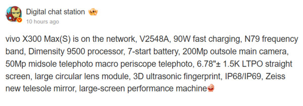 Stattdessen konzentriert sich der Leaker auf das Vivo X300 Max. Aus der 3C-Zertifizierung geht unter anderem hervor, dass das Handy genau wie das Vivo X300 und das Vivo X300 Pro Fast Charging mit bis zu 90 Watt unterstützen wird. Zusätzlich zu dieser hohen Ladegeschwindigkeit redet Digital Chat Station von einem rund 7.000mAh großen Akku und dem MediaTek Dimensity 9500 Prozessor. Zu den restlichen technischen Spezifikationen sollen ein 6,78 Zoll messendes LTPO-OLED-Display mit 1440p-Auflösung, eine Zeiss-Optik und eine IP-Zertifizierung gehören.