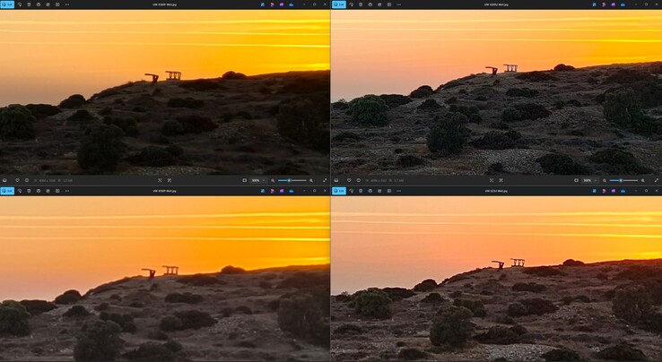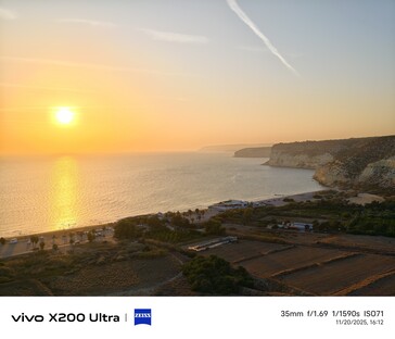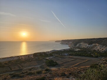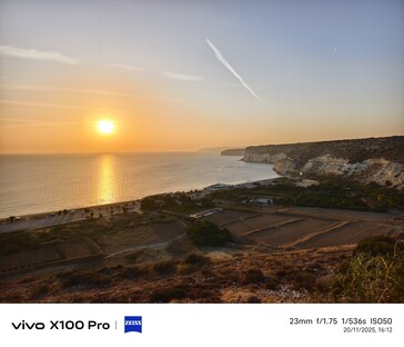 Für das zweite Beispiel sind wir zurück in Kourion und blicken auf die untergehende Sonne sowie Kourion Beach. Der 1-Zoll-Sensor des Vivo X100 Pro liefert die farbenfrohste Version des Sonnenuntergangs, aber nicht unbedingt die korrekteste, so rot war die Sonne zu dem Zeitpunkt noch nicht. Trotz größtem Sensor und der längsten Verschlusszeit ist das Foto am dunkelsten. Die größte Dynamik zeigt erwartbar das Vivo X300 Pro. Das Galaxy S23 Ultra Foto meldet übrigens ISO 10 und 1/1000s bei F/1.7 Blende.