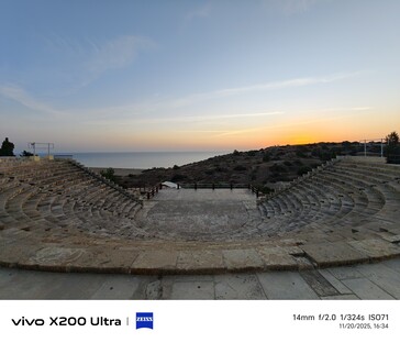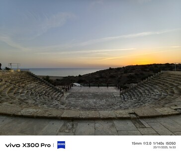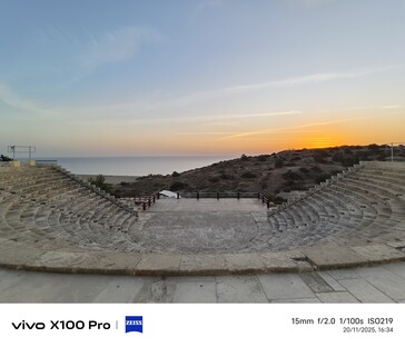 Für das zweite Ultraweitwinkel-Beispiel wechseln wir ins 81 Kilometer entfernte Curium (Kourion), eine antike Ausgrabungsstätte mit toller Aussicht auf die Umgebung. Im November ist hier auch wenig los, sodass man das ganze Areal teils für sich alleine hat, etwa das Amphitheater bei Sonnenuntergang. Hier ist auch das Samsung-Handy aus 2023 mit im Vergleich der Ultraweitwinkel-Kameras (jeweils immer rechts unten).