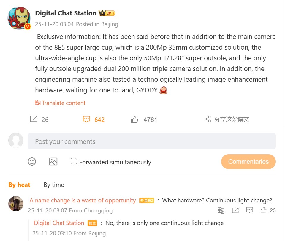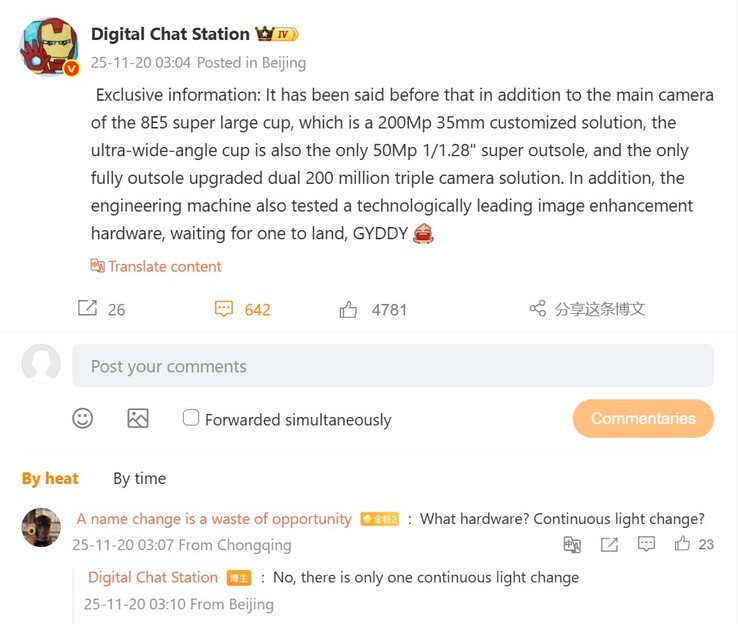 Das bekräftigt der meist sehr zuverlässige Leaker Digital Chat Station aktuell noch mal in einem Weibo-Post und nennt die wichtigsten Eckdaten des Vivo X300 Ultra, das einmal mehr eine 35mm Hauptkamera basierend auf einem adaptierten 200 Megapixel Sensor - erwartet wird der 1/1.12 Zoll große Sony LYT-910 - mit einem 1/1.28 Zoll großen Ultraweitwinkel (wohl LYT-828) und einem erneuerten 200 MP Periskop-Telefoto (wohl auf Basis des ISOCELL HPB) kombinieren wird. Interessant an dem Weibo-Post ist allerdings der Hinweis auf eine weitere Neuigkeit, die aktuell von Vivo getestet wird. Wobei es sich dabei konkret handelt, ist noch nicht ganz klar, es scheint eine Bild-Optimierungshardware zu sein, die technologisch führend ist, wie Digital Chat Station betont.