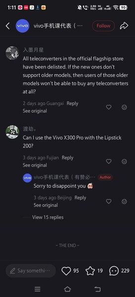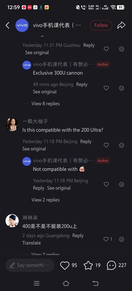 Das neue Telefoto bietet einen vermutlich besseren Sensor und wurde insbesondere im Hinblick auf den neuen 400mm Telekonverter in punkto Stabilisierung stark verbessert. Die Kritik bezieht sich also rein auf die maximal mögliche Lichtsensitivität, ansonsten dürfte das Telefoto wahrscheinlich besser funktionieren als beim Vorgänger. Unschön ist aber noch eine andere Geschichte und zwar in punkto Kompatibilität der neuen Telekonverter. Sowohl der verkleinerte Tele-Extender G2 mit 200mm Brennweite als auch der G2 Ultra mit 400mm Brennweite wird laut offiziellen Hinweisen aus der chinesischen Little Red Book App nicht mit dem Vivo X200 Ultra oder dem Vivo X300 Pro (hier bei Amazon erhältlich) kompatibel sein.
