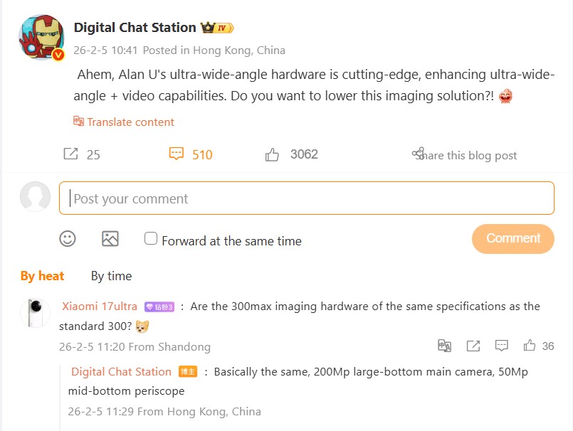 Ein gewichtiger Vorteil des Vivo X200 Ultra gegenüber der Konkurrenz war und ist die 1/1.28 Zoll große Ultraweitwinkel-Kamera im Vergleich mit der gesamten Smartphone-Konkurrenz. Und auch dieses Asset dürfte der Nachfolger weiter ausbauen, wie Digital Chat Station unlängst auf Weibo ausführte. Insbesondere Video-Aufnahmen sollen wohl vom industrieweit besten Ultraweitwinkel profitieren. Interessant an diesem Posting ist auch ein Kommentar, in dem von einem Vivo X300 Max die Rede ist, das offenbar parallel zum Vivo X300 Ultra in China starten wird. Hierbei dürfte es sich um eine größere Vivo X300 (hier bei Amazon erhältlich) Variante mit ähnlicher Kamera-Ausstattung handeln.