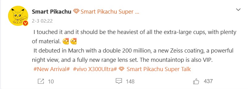 Leaker wie Smart Pikachu und Digital Chat Station, die betonen, bereits Testgeräte mit eigenen Augen gesehen zu haben, lieferten aber teils auch neue Infohäppchen zum Vivo X300 Ultra. So schreibt ersterer etwa von besserer Videoqualität bei Nutzung des Telekonverters, der zudem erneuert wurde und laut Digital Chat Station der Konkurrenz weit voraus sei, konkret werden auch neue Tricks angedeutet. Was dieser "neue Job" konkret sein könnte, wird auf Weibo eifrig spekuliert, insbesondere optischer Zoom wird mehrfach erwähnt, was zu früheren Gerüchten rund um optischen Zoom passt, allerdings möglicherweise nur mittels externer Optik und nicht wie beim Xiaomi 17 Ultra direkt im Smartphone integriert.