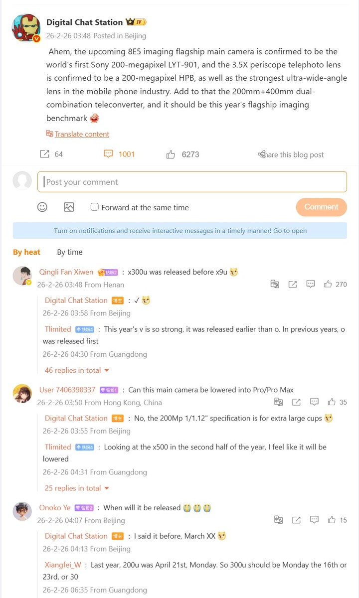 Wir rechnen mit dem offiziellen Vivo X300 Ultra Launch beziehungsweise der Verfügbarkeit dennoch zuerst in China, schön zu sehen allerdings, dass sich Vivo die global sehr wichtige Tech-Messe in Barcelona nicht entgehen lässt. Auch Digital Chat Station hat sich heute auf Weibo wieder zum Vivo X300 Ultra geäußert und bekräftigt dort nicht nur den ersten 200 Megapixel LYT-901 Sensor von Sony für die 35mm Hauptkamera, der mit 1/1.2 Zoll deutlich größer als alle anderen bisher verfügbaren 200 Megapixel Sensoren sein wird sondern auch den vom Vivo X300 Pro bekannten 1/1.4 Zoll 200 Megapixel ISOCELL HPB Sensor für das 3,5x Telefoto.