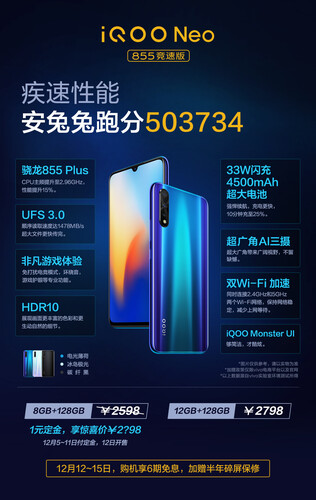 Wer mit dem daddeln will erhält auf dem neuesten iQoo-Handy das Android 9 Pie basierte "Monster UI" Features wie "Game Box" und "Game Space", die das Daddeln auf dem Smartphone noch komfortabler machen sollen. Erhältlich ist das Vivo iQoo Neo 855 Racing Edition mit 8/128 GB Speicher zu einem Preis von 2.598 Yuan, umgerechnet rund 333 Euro. Das iQoo Neo 855 Racing Edition mit 12/128 GB wird für 2.798 Yuan (360 Euro) angeboten. Ob und wann dieses Modell international angeboten wird hat Vivo bislang nicht verraten.