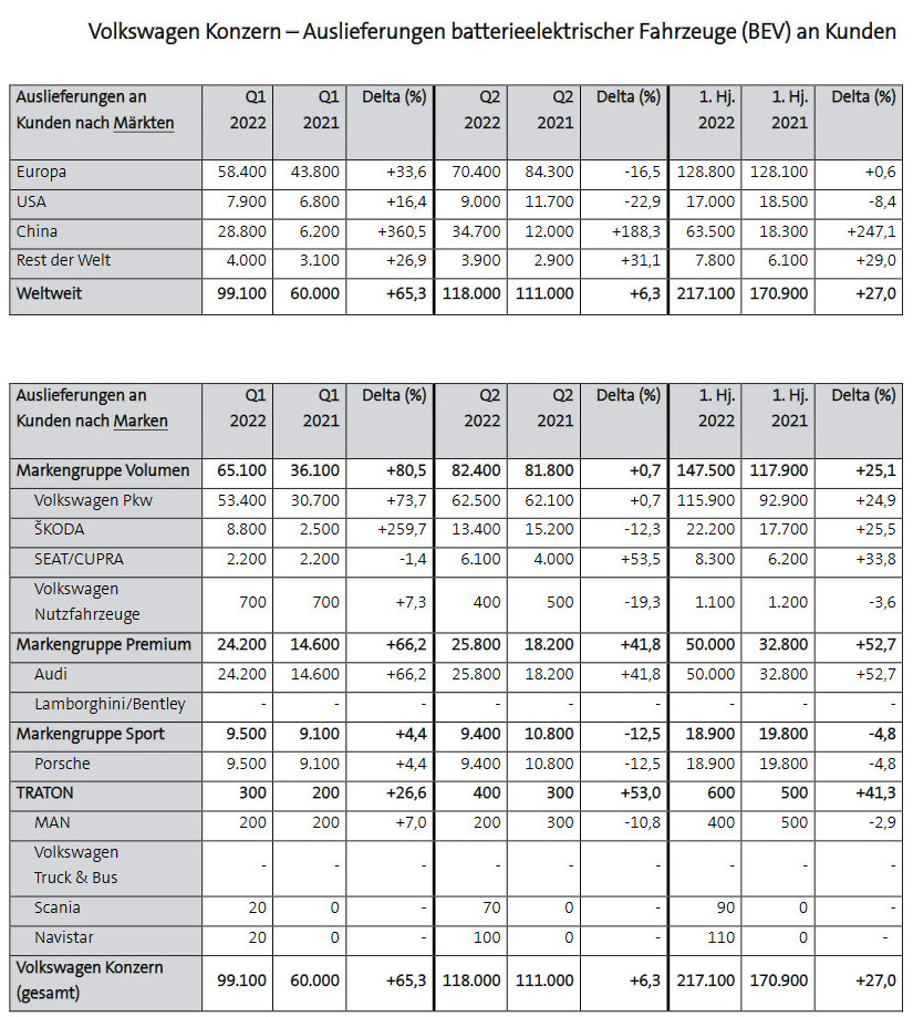 Von der Kernmarke Volkswagen wurden bis Ende Juni insgesamt 115.900 rein batteriebetriebene E-Autos an Kunden ausgeliefert, die zusammen einen Anteil an der Konzernsumme von 53 % ausmachen. Es folgen Audi mit 50.000 Elektroautos, (23 Prozent), Skoda mit 22.200 Stromern (10 Prozent), Porsche mit 18.900 BEVs (9 Prozent) und Seat/Cupra mit 8.300 rein elektrischen Pkw-Modellen (4 Prozent).