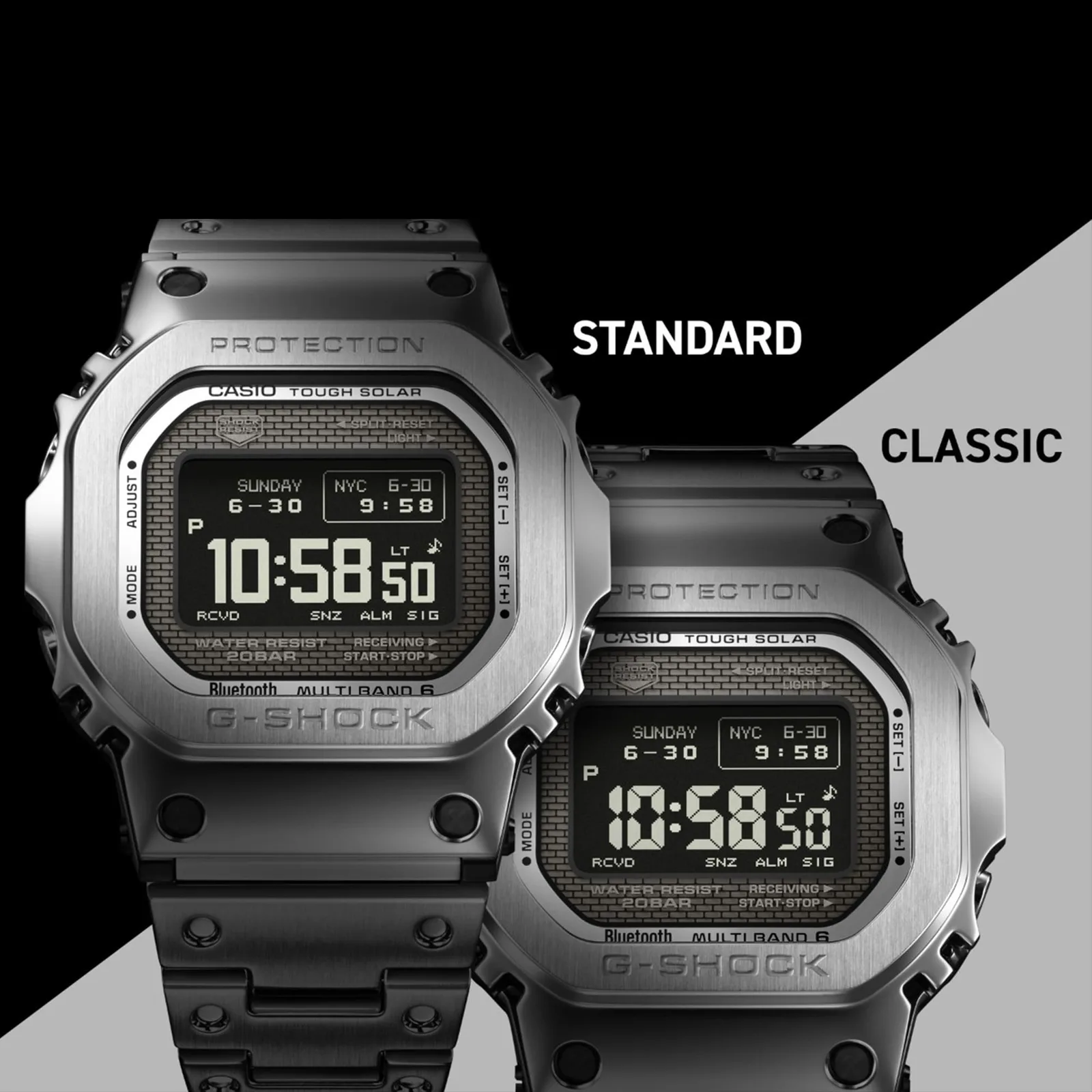 Technisch markiert die GMW-BZ5000 einen Meilenstein: Sie ist die erste Vollmetall-Quadratuhr von Casio mit einem kontrastreichen Memory-in-Pixel (MIP)-LCD, das ein schärferes und flexibleres digitales Layout bietet als frühere G-Shock-Quadratuhren. Nutzer können mehrere Zeitanzeige-Modi auswählen und die Schriftart über die Begleit-App zwischen Standard und dem klassischen 7-Segment-Stil wechseln. Unter der Haube bietet die Uhr die gewohnte G-Shock-Ausstattung: 20 bar Wasserdichtigkeit, Tough Solar-Aufladung, stoßfeste Konstruktion, Bluetooth Smartphone Link, Multiband-6-Funksteuerung, Weltzeit, Stoppuhr, Countdown-Timer, fünf Alarme und eine vollautomatische LED-Hintergrundbeleuchtung.