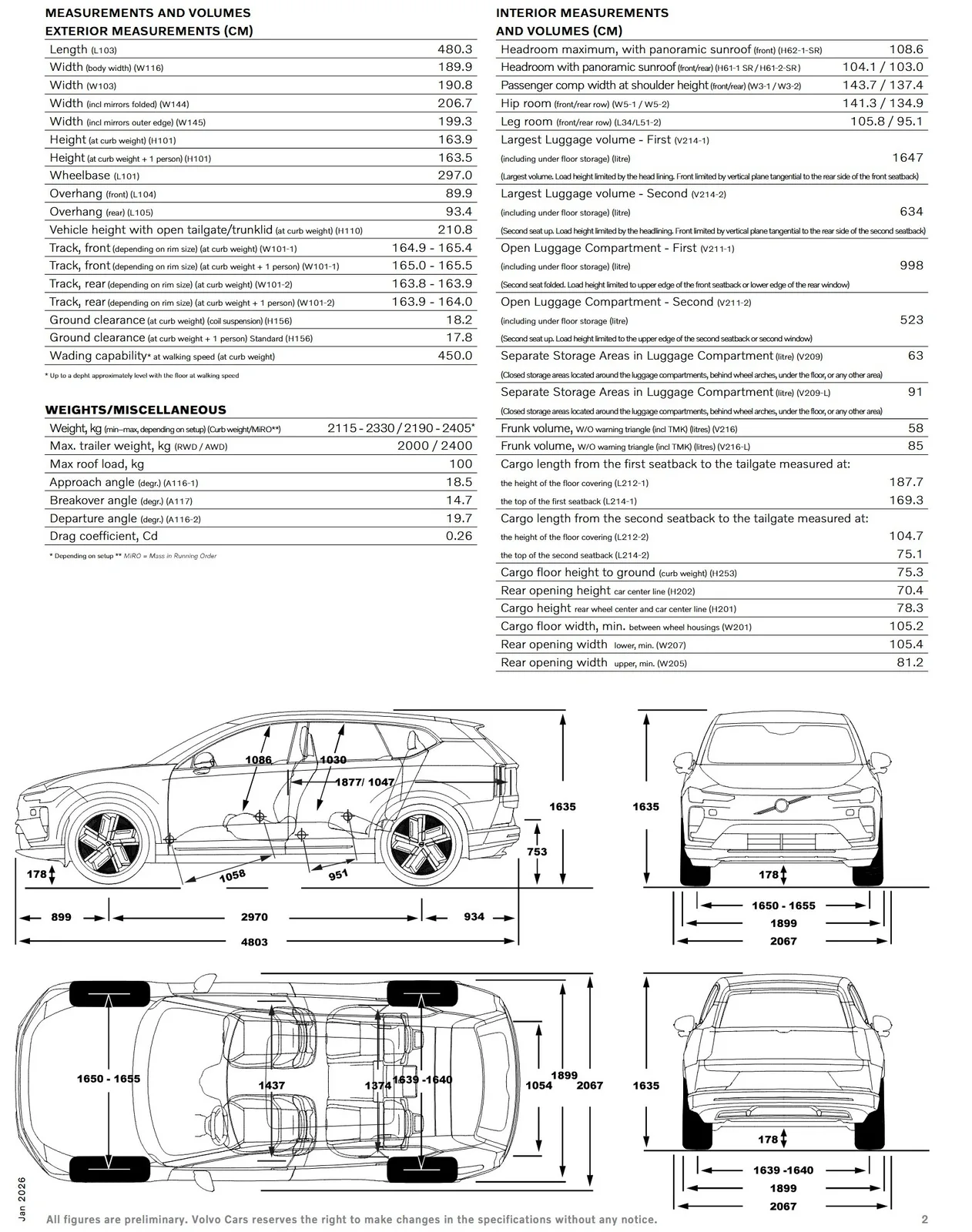Der EX60 führt bei Volvo die neue Produktarchitektur SPA3 ein. Diese nutzt moderne Fertigungsverfahren wie Megacasting und eine Cell-to-Body-Bauweise, um Gewicht zu sparen und die Steifigkeit zu erhöhen. Der Luftwiderstandsbeiwert liegt bei aerodynamischen 0,26. Auch praktisch liefert der Volvo ab, wobei es beim Kofferraum auf die Messmethode ankommt: Volvo nennt üppige 634 Liter (plus 58 Liter Frunk unter der Haube), nach strenger VDA-Norm (ADAC) sind es 523 Liter. Wer ziehen muss, darf sich freuen: Die Allrad-Modelle bieten bis zu 2.400 kg Anhängelast (RWD: 2.000 kg). Während die Standard-Modelle auf ein Stahlfahrwerk setzen, bleibt die Luftfederung zunächst der später folgenden Cross Country-Variante vorbehalten.