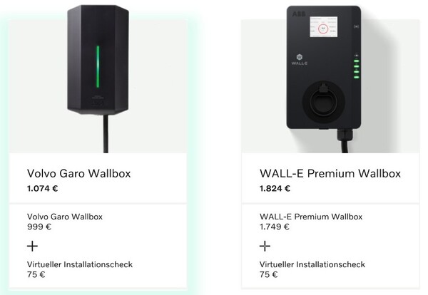 Der Münchner Anbieter Wall-E hat zwei 11-kW-Wallboxen im Programm. Neben der 999 Euro teuren Volvo-Wandladestation von Garo mit festem Typ-2-Ladekabel, sind damit auch zwei ABB-Wallboxen ab 885 Euro erhältlich. Sie erlauben dreiphasiges Laden mit bis zu 400 Volt, lassen sich per Smartphone steuern und sind dank wahlweise integriertem geeichtem Stromzähler dienstwagenkonform. Durch die Kompatibilität der Wallboxen mit Photovoltaik-Anlagen kann der genutzte Strom dabei auch grün vom eigenen Dach kommen.