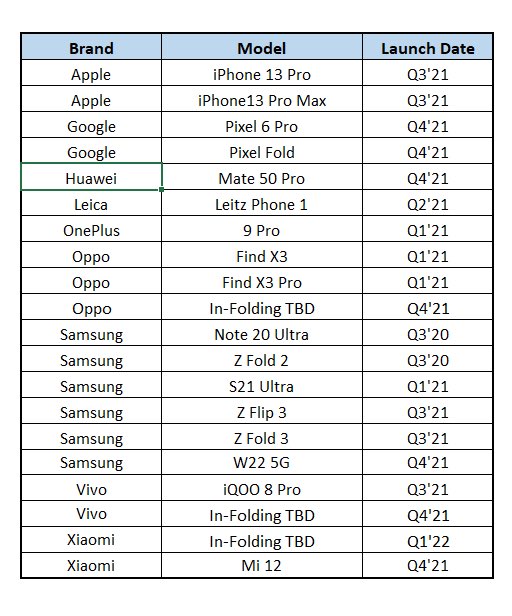 Wobei das mit der Jahreszahl so eine Sache ist. Denn auf der Liste für dieses Jahr findet sich neben dem tatsächlich nahenden Pixel 6 Pro auch das gemunkelte Pixel Fold von Google, jenes Foldable, das möglicherweise als Überraschungsgast bei Googles Hardware-Event im Oktober präsentiert werden könnte, vermutlich aber nicht mehr in diesem Jahr tatsächlich zu kaufen sein wird. Auch dieses setzt auf ein Samsung Display mit dynamischer 120 Hz Refreshrate genauso wie die kommenden Foldables von Oppo und Vivo. Auf der Liste findet sich zudem das Samsung W22 5G als Bruder des Galaxy Z Fold3 sowie das von Xiaomi im Winter erwartete Mi Mix Fold 2.