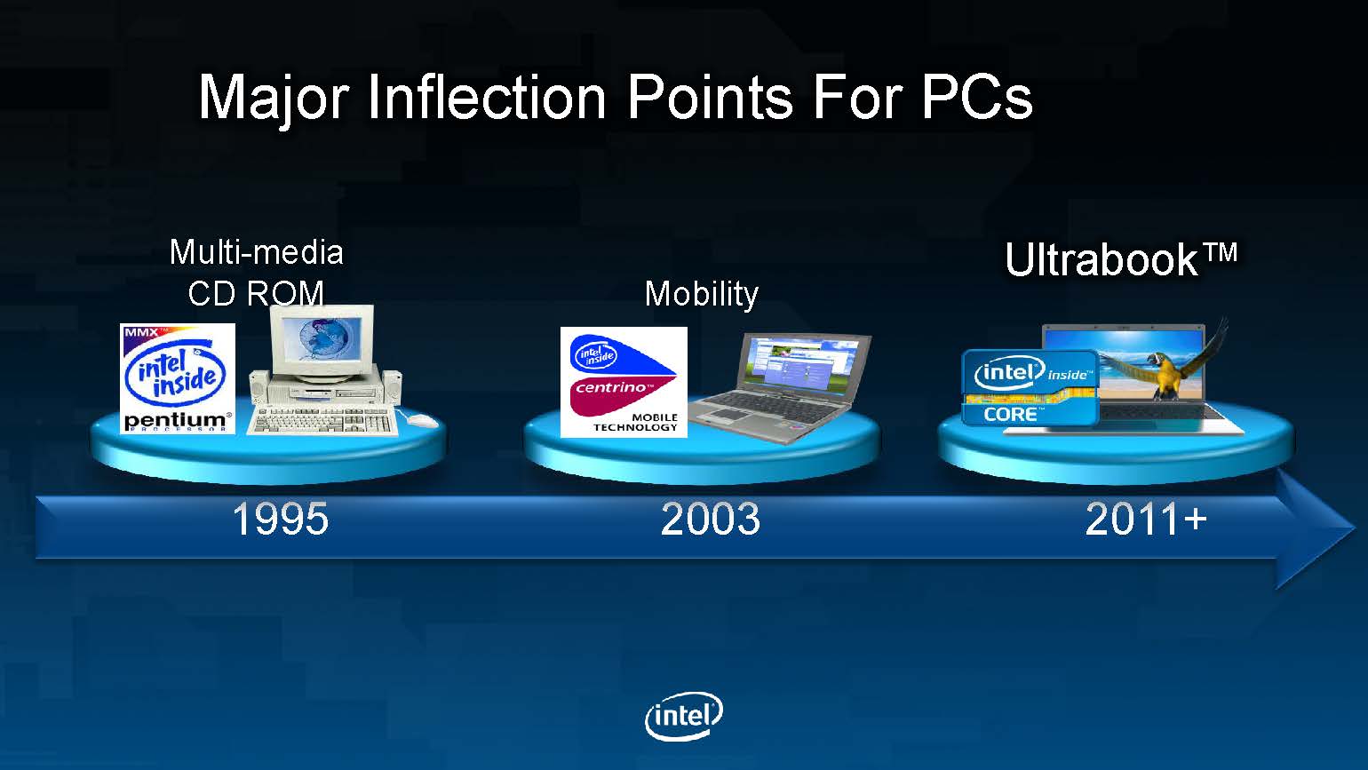 Ajay Bhatt, Chief Platform Architect von Intel hat auf dem IDF 2012 in San Francisco die Entwicklung der PCs hin zu Ultrabooks aufgezeigt: Der Weg vom Personal Computer (PC) zum Personal Computing. War im Jahr 1995 bei PCs Multimedia und ein CD-ROM noch eine Sensation, begann 2003 der Übergang ins das mobile Zeitalter mit Notebooks. Seit 2011 ist nun eine neue Rechnergeneration auf dem Vormarsch: Ultrabooks.