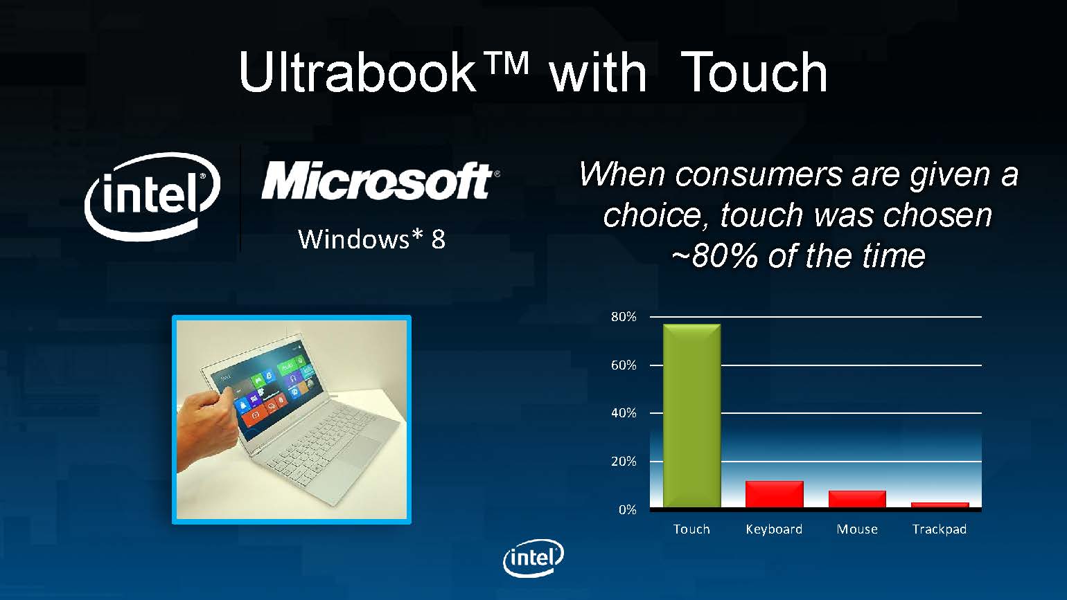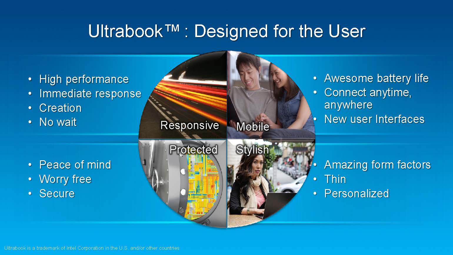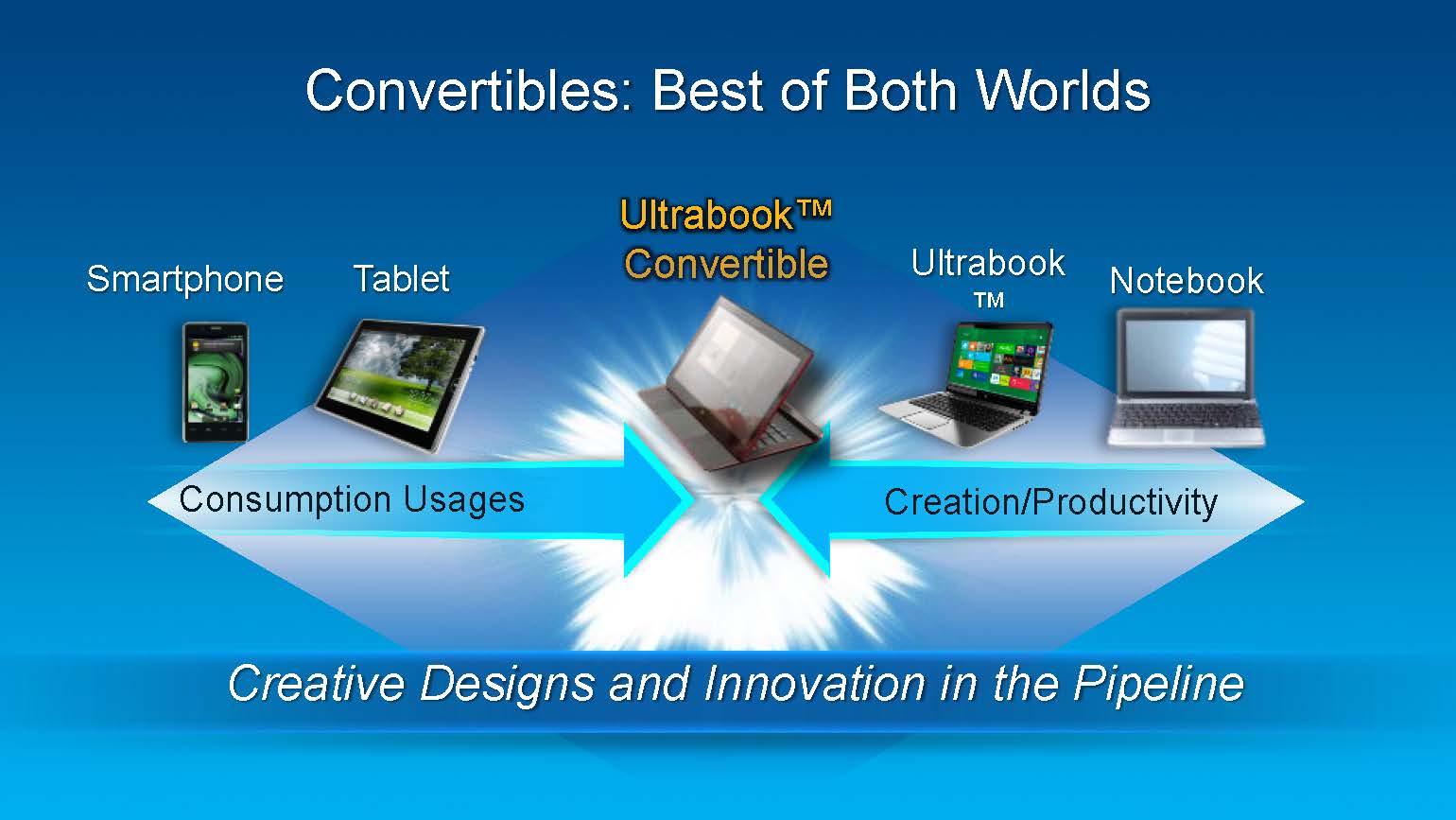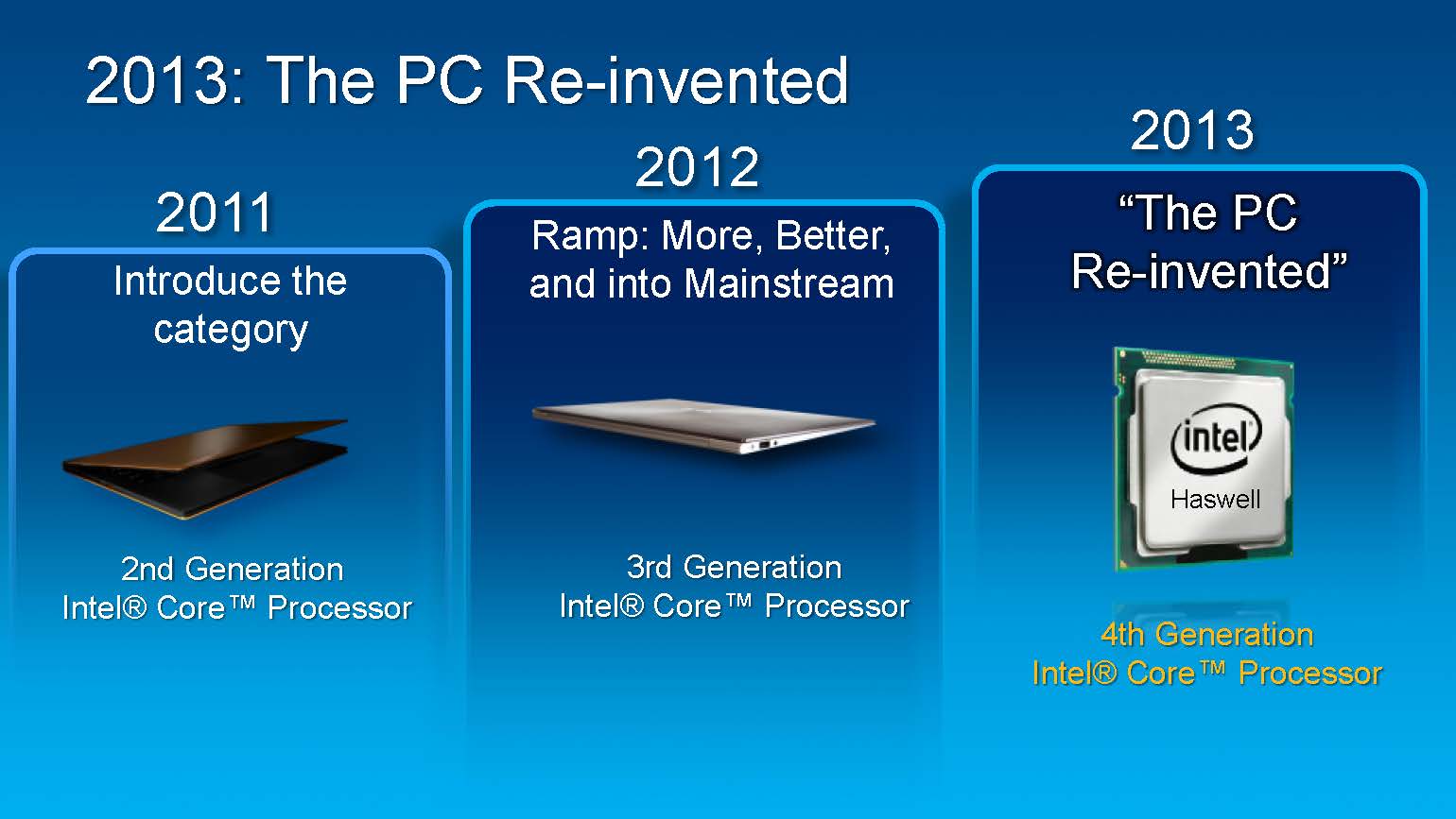 2013 steht bei Intel unter dem Slogan "The PC Re-invented", was so viel heißt, wie "der PC neu erfunden". Offenbar setzt Bhatt auch bereits Intels neue Vorgaben hinsichtlich der Vermeidung von Codenamen für seine künftigen Prozessoren um und spricht statt von "Haswell" nun von "4. Generation Intel Core Prozessor". Künftig sollen Ultrabooks als Hybrid oder Convertible die Brücke zwischen Smartphones und Tablets auf der einen Seite und Notebooks und Ultrabooks auf der anderen schlagen.
