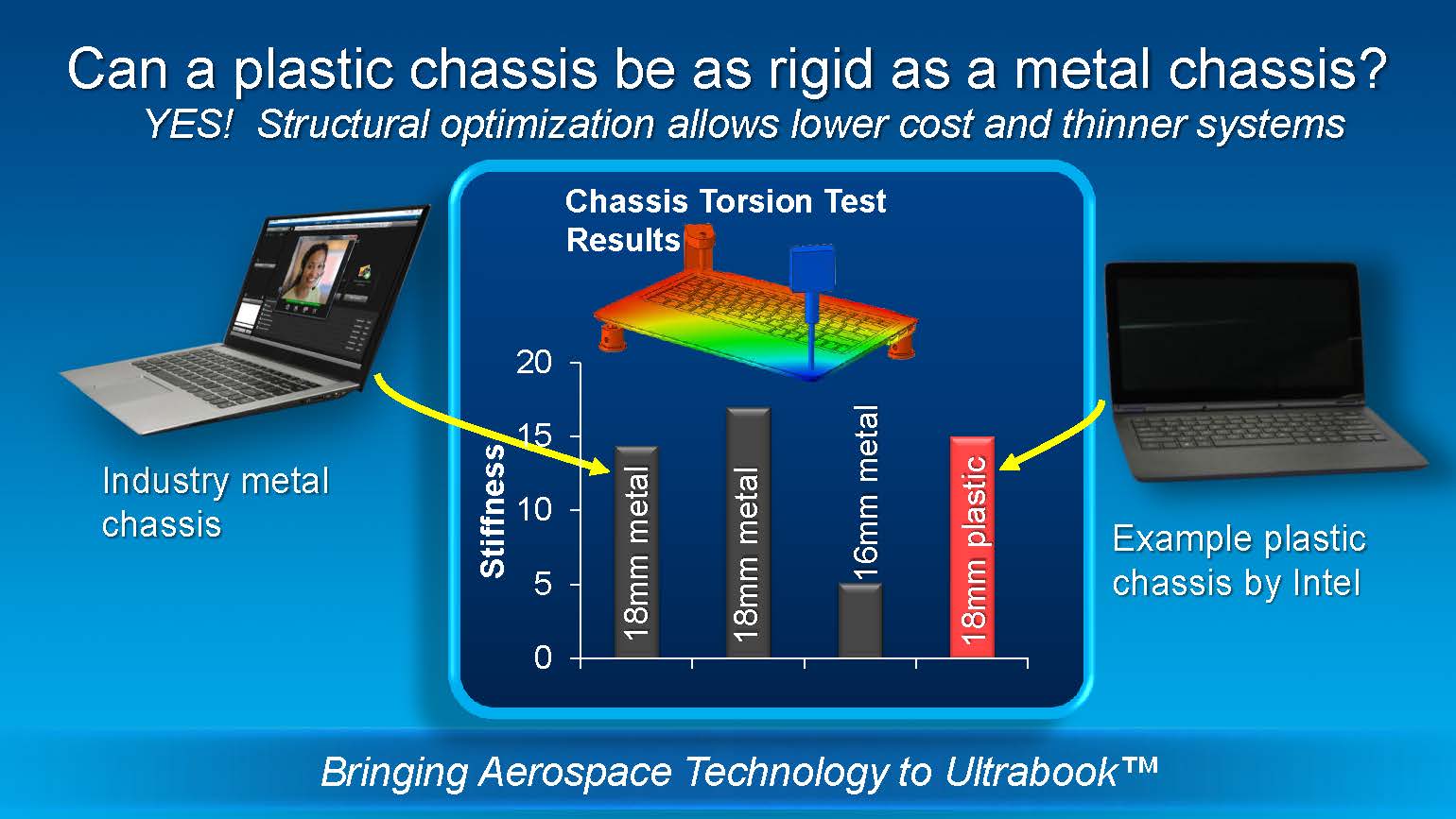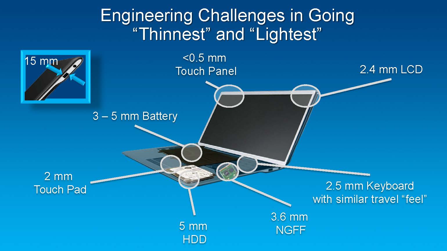 Hier differenziert Bhatt bei der weiteren Entwicklung von Ultrabooks zwischen Gehäusen und Displays. Ultrabooks stellen für die Ingenieure aber grundsätzlich eine echte Herausforderung dar. Die Bauhöhe der kommenden Kernkomponenten soll weiter schrumpfen, LCDs und Festplatten beispielsweise nur noch mit einer Dicke von 2,4 respektive 5 Millimetern aufwarten. Neue Plastikgehäuse sollen die Preise für Ultrabooks weiter senken.