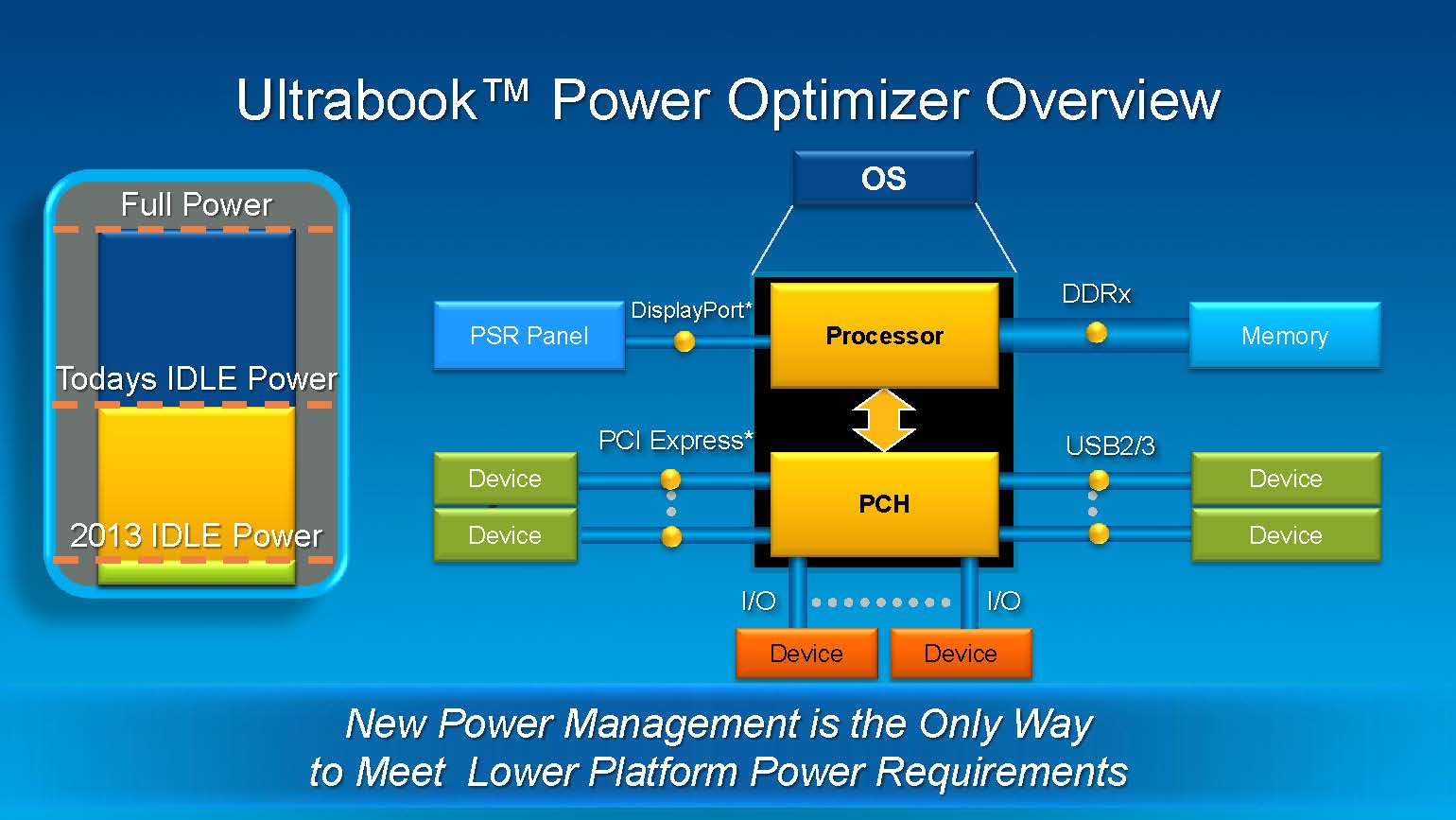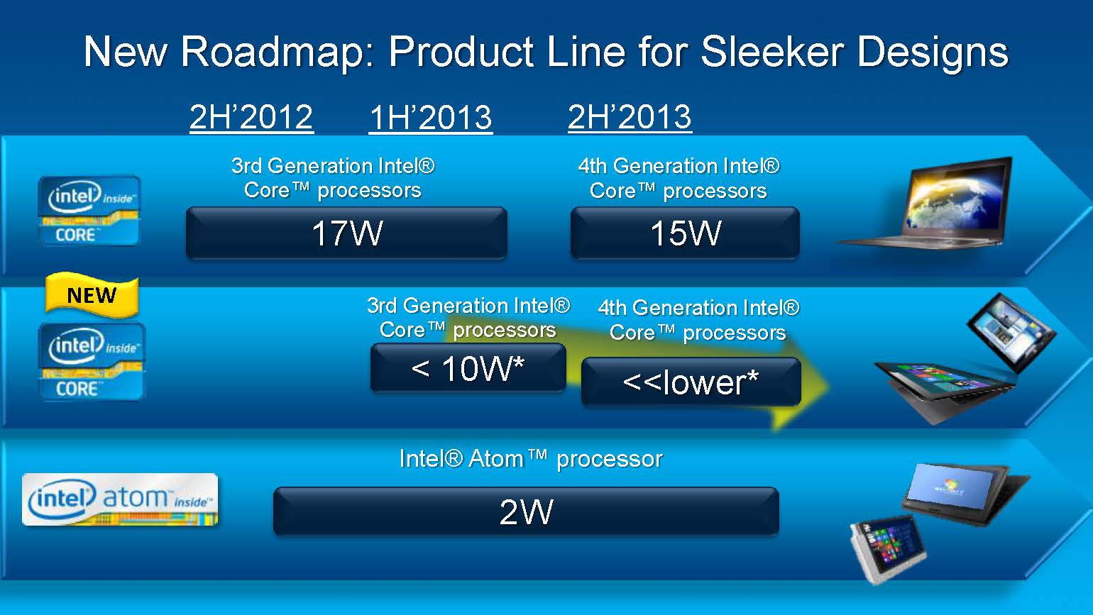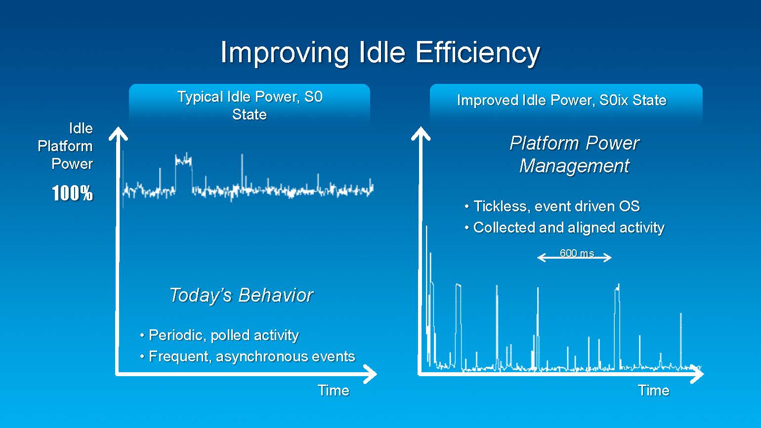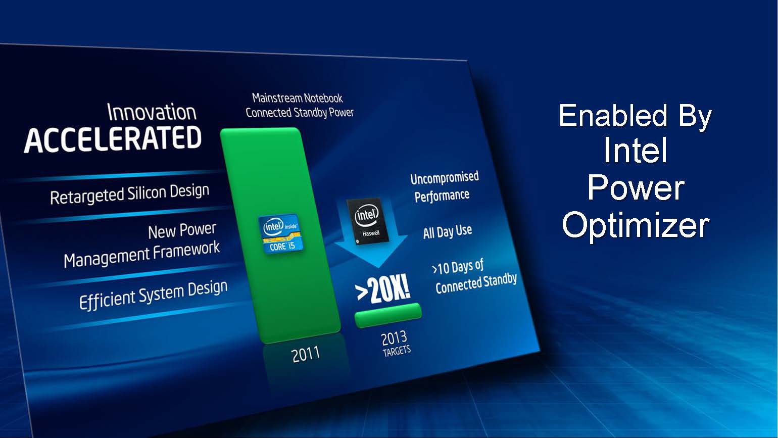 Bei den CPUs kündigt Intel für seine 4. Generation der Intel Core-CPUs mit Codename Haswell neben der bisher bekannten Thermal Design Power (TDP) von 15 Watt auch SKUs mit einer TDP von weniger als 10 Watt an. Hierfür krempelt Intel die Stromsparmechanismen der Chips und Treiber gehörig um. So soll der Energieverbrauch im Connected Standby (CS) mit Haswell insgesamt um den Faktor 20 sinken und Akkulaufzeiten von bis zu 10 Tagen (CS) erlauben.