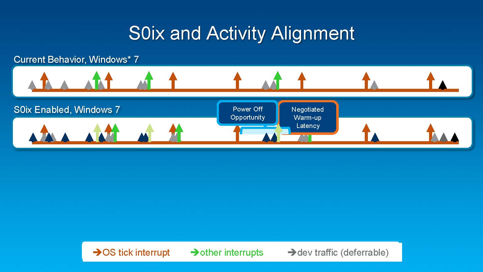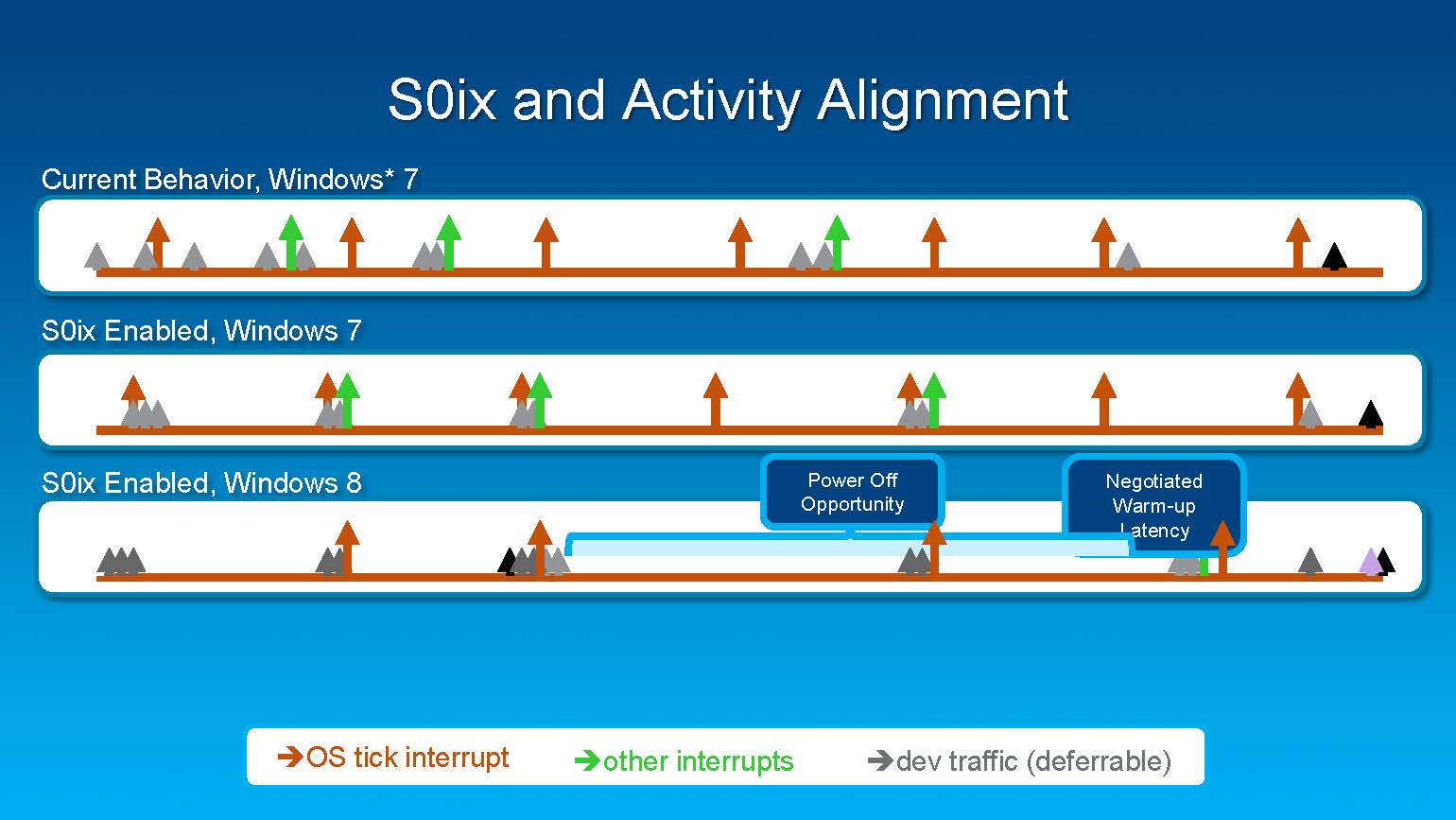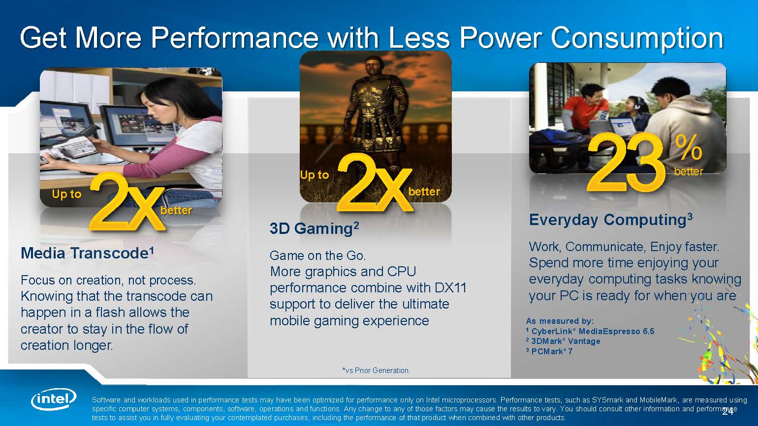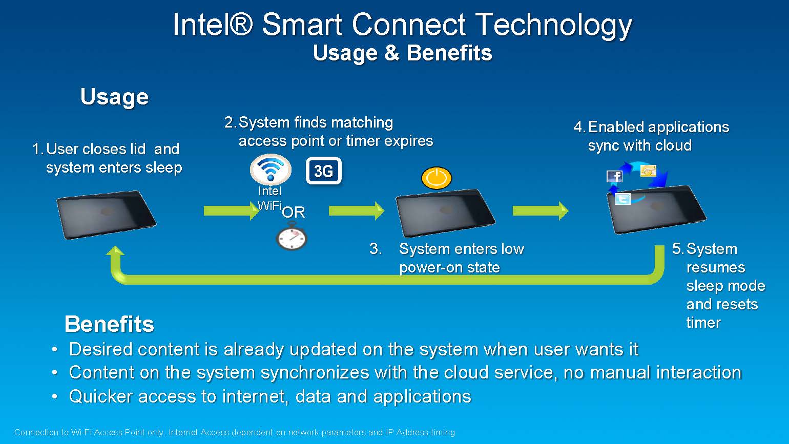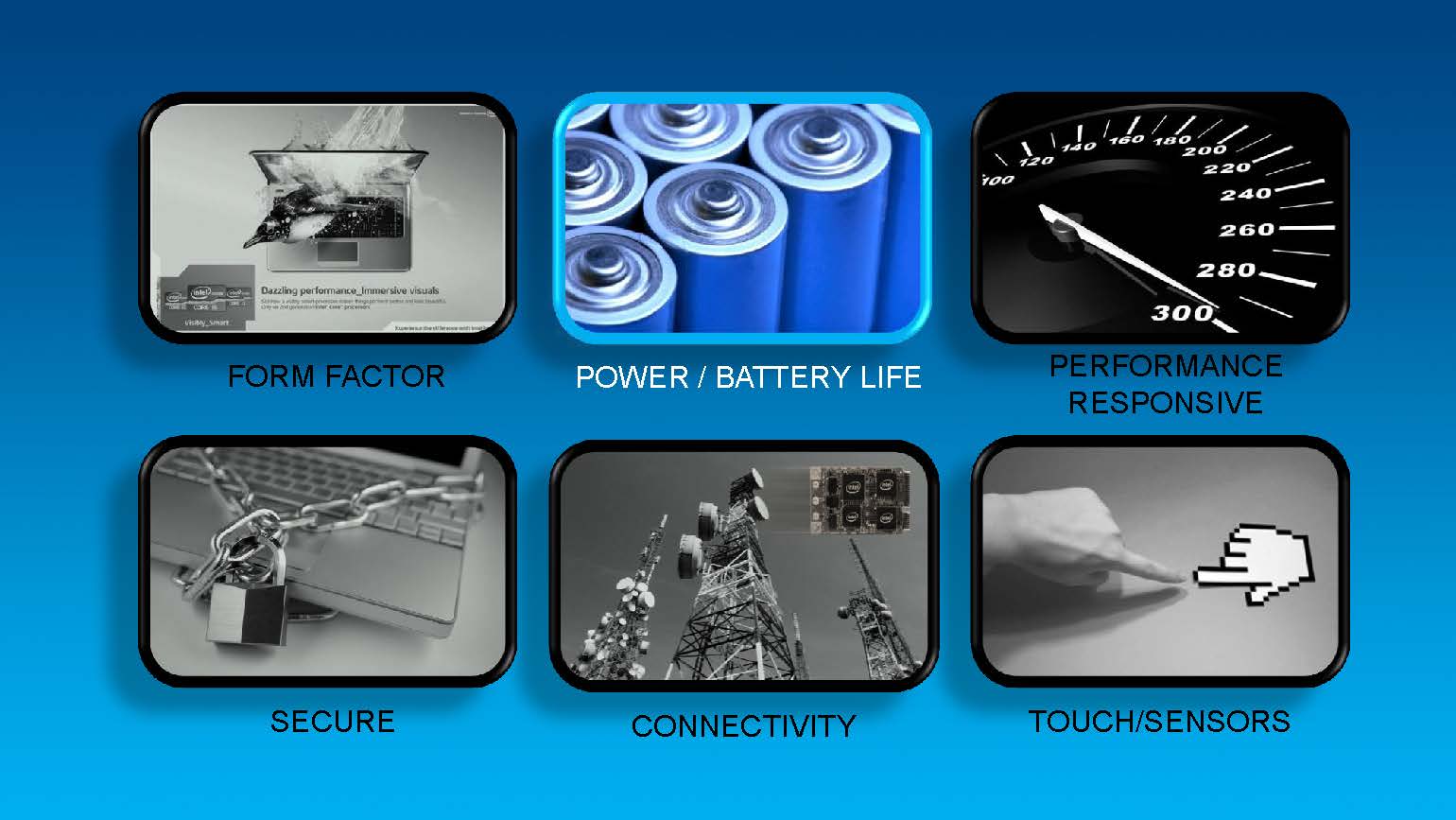 Bei den CPUs kündigt Intel für seine 4. Generation der Intel Core-CPUs mit Codename Haswell neben der bisher bekannten Thermal Design Power (TDP) von 15 Watt auch SKUs mit einer TDP von weniger als 10 Watt an. Hierfür krempelt Intel die Stromsparmechanismen der Chips und Treiber gehörig um. So soll der Energieverbrauch im Connected Standby (CS) mit Haswell insgesamt um den Faktor 20 sinken und Akkulaufzeiten von bis zu 10 Tagen (CS) erlauben.