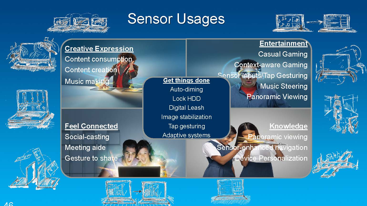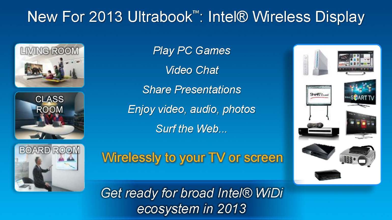 Weiterhin hat Intel für die kommende Generation der Ultrabooks weitere Verbesserungen bei Sicherheit, den Displays und Touchscreens sowie neuen Technologien, wie Intels drahtloser Aufladetechnik für Ultrabooks und Smartphones namens "Intel Wireless Charging" angekündigt.