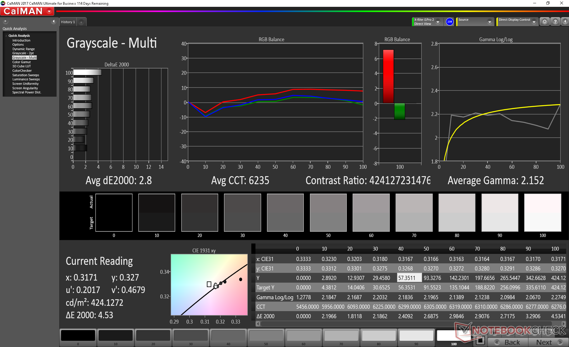 Die Abmessungen des X-Rite-Spektralfotometers zeigen, dass die Farbtemperatur etwas wärmer ist als erwartet. Daher liegt der DeltaE-Wert für Farben und Graustufen bei höherer Sättigung höher. Dies könnte durch eine Kalibrierung des Panels ausgeglichen werden, was aber für die meisten Nutzer nicht notwendig sein sollte.