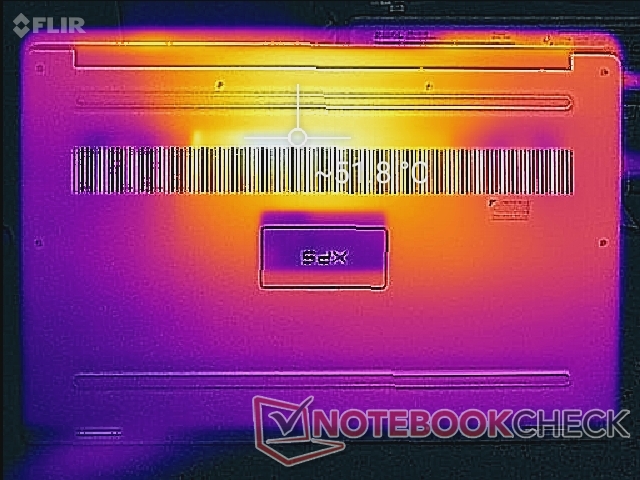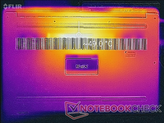 Die Oberflächentemperatur hat sich ebenfalls nicht verändert, da sie stark mit dem unveränderten Kühlsystem und der Energieaufnahme zusammenhängt. Die Temperaturentwicklung bleibt großteils symmetrisch - in der Mitte der Tastatur entsteht ein Hotspot. Beim Gamen erreicht diese Stelle bis zu 56 °C (siehe unten). Die Handballenablage aus Kohlefaser fühlt sich immer warm an, wird aber nie so warm wie die Tasten. Vor allem die WASD-Tasten erreichen unter hoher Last bis zu 37 °C. Sollten Sie jemals versucht haben, auf einem XPS 15 mit GeForce-GPU zu gamen, wird Ihnen diese Beschreibung bekannt vorkommen.