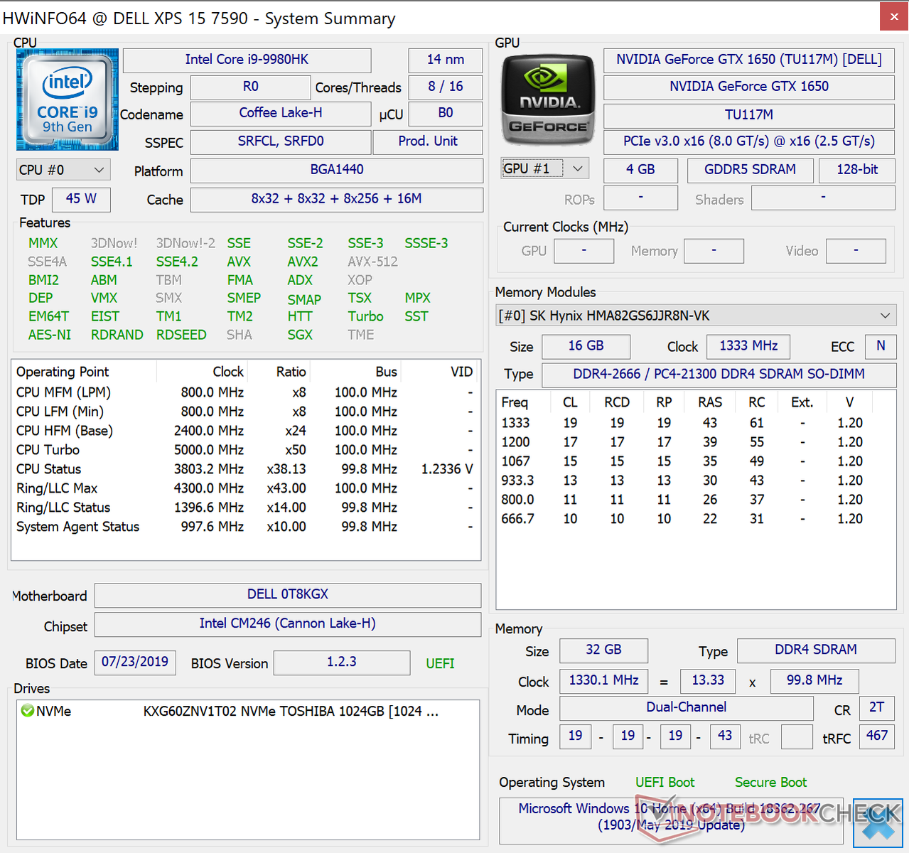 | Dell XPS 15 7590 9980HK GTX 1650 i9-9980HK, GeForce GTX 1650 Mobile, Toshiba XG6 KXG60ZNV1T02, OLED, 3840x2160, 15.6" | Dell XPS 15 9570 Core i9 UHD i9-8950HK, GeForce GTX 1050 Ti Max-Q, Samsung SSD PM981 MZVLB1T0HALR, IPS, 3840x2160, 15.6" | Asus ZenBook 15 UX533FD i7-8565U, GeForce GTX 1050 Max-Q, WDC PC SN520 SDAPNUW-512G, IPS, 1920x1080, 15.6" | HP Spectre x360 15-df0126ng i7-8750H, GeForce GTX 1050 Ti Max-Q, Toshiba XG5-P KXG50PNV2T04, IPS, 3840x2160, 15.6" | Gigabyte Aero 15 OLED XA i7-9750H, GeForce RTX 2070 Max-Q, Intel SSD 600p SSDPEKKW512G8L, OLED, 3840x2160, 15.6" | Razer Blade 15 RTX 2080 Max-Q i7-9750H, GeForce RTX 2080 Max-Q, Samsung SSD PM981 MZVLB512HAJQ, IPS, 1920x1080, 15.6" | MSI GF75 Thin 9SC i7-9750H, GeForce GTX 1650 Mobile, Crucial P1 SSD CT1000P1SSD8, IPS, 1920x1080, 17.3" | |