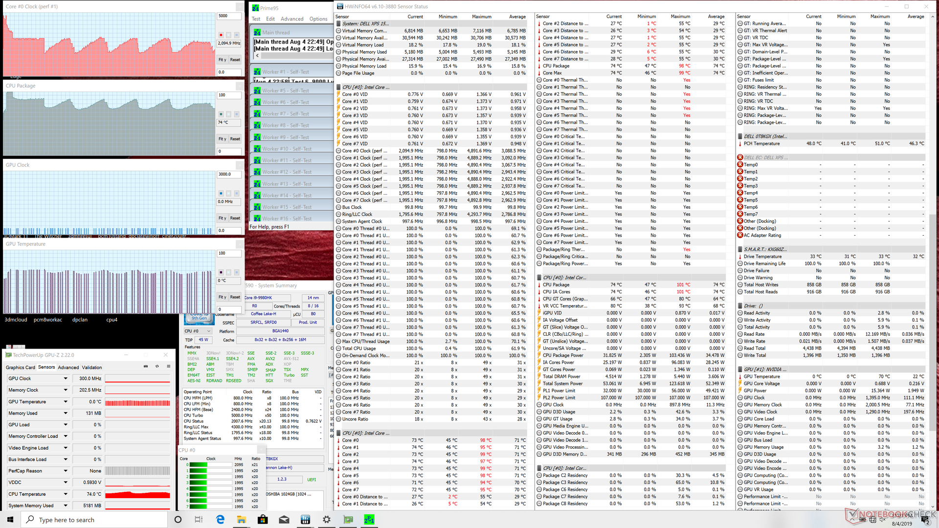 Da die Basistaktrate des Core i9-9980HK bei 2,4 GHz liegt, drosselt die CPU ab und zu auf 1,9 GHz hinunter und erreicht nur einen schwachen Turbo von +300 MHz. Die meisten anderen Laptops mit Core H halten üblicherweise unter den gleichen Prime95-Bedingungen eine bestimmte Taktrate und Temperatur aufrecht. Dell versucht hier vermutlich, bei starker Last noch mehr Leistung aus dem Prozessor herauszukitzeln. Nichtdestotrotz hätte der Core i9-9980HK eindeutig viel mehr Leistung zu bieten und wird vom XPS 15 eingeschränkt.