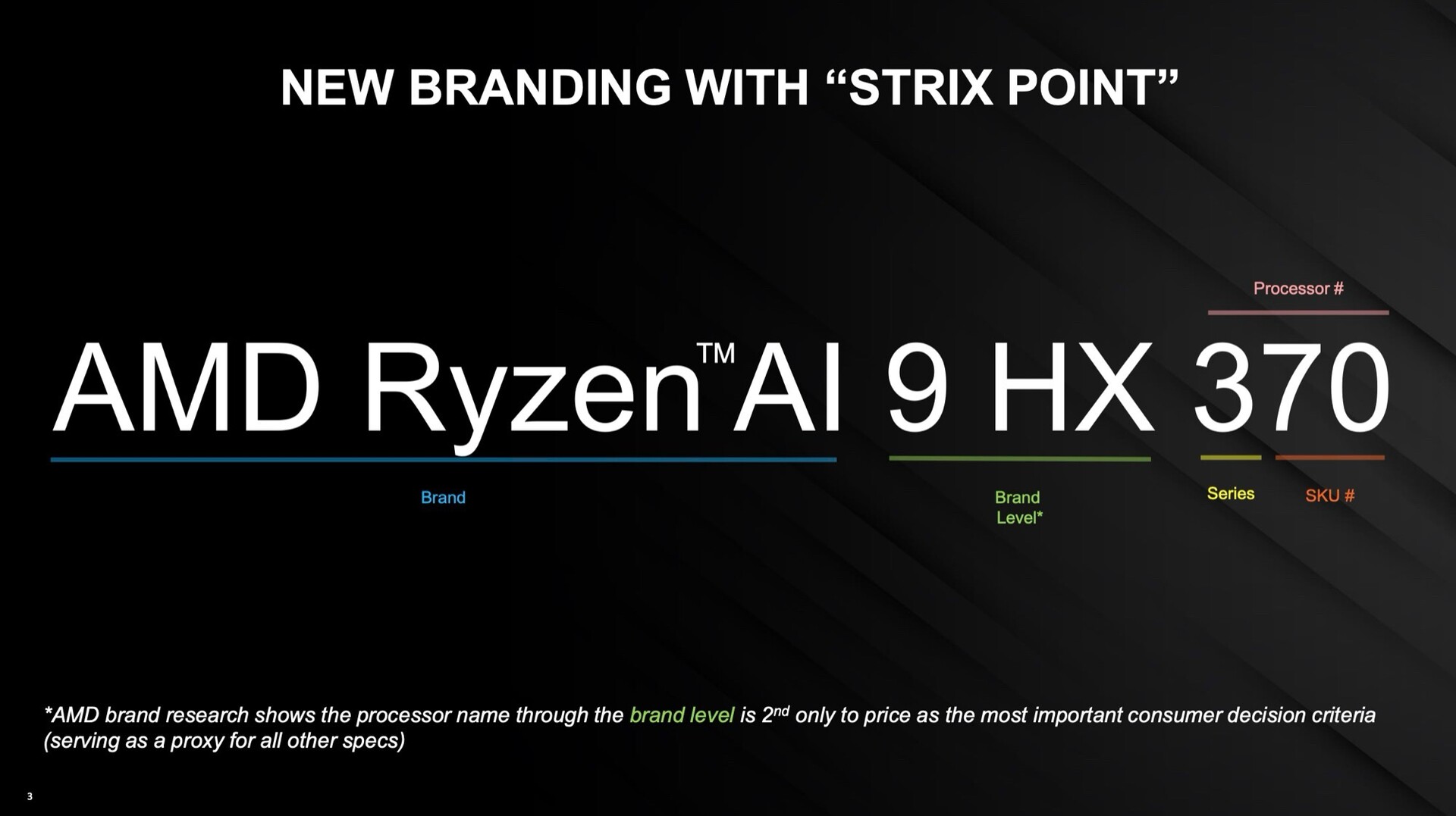 Zeitgleich mit der Ankündigung der Ryzen 9000 "Granite Ridge" Desktop-Prozessoren hat AMD ein neues Namens-Schema enthüllt, das ab den Notebook-CPUs der nächsten Generation zum Einsatz kommen soll. Der Nachfolger des AMD Ryzen 7 8840U würde demnach als AMD Ryzen AI 7 U 370 vermarktet werden. "Ryzen AI" soll Kunden dabei vermitteln, dass die Chips mit einer schnellen NPU ausgestattet sind, "7" zeigt wie schon bisher die Preisklasse, während "U", "HS" und "HX" weiterhin Aufschluss auf die Produktklasse bzw. die TDP der Chips geben.