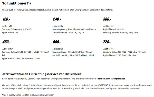 Für das brandneue Galaxy Z Fold4 und Galaxy Z Flip4 gibt es bis zu 720 Euro Ankaufprämie für ein Altgerät. Hier stellen Samsung und die Aktionshändler klar, dass dieser Cash-back nur bei gleichzeitigem Neukauf eines Samsung Galaxy Z Flip 4 oder Galaxy Z Fold4 im Markt oder im Onlinehhop gilt. Der Aktionszeitraum läuft von 26.08.2022 bis 30.09.2022 und ist nicht kombinierbar mit laufenden Direktabzug-Aktionen. Bei Inzahlungnahme muss das alte Gerät bis zum 31.10.2022 an die Foxway GmbH zurückgesendet werden.