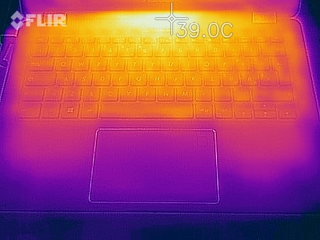 Die Temperaturentwicklung des passiv gekühlten Convertibles ist vollkommen unproblematisch. Wie wir bereits auf dem Foto des Innenaufbaus gesehen haben, sitzt der SoC samt der Heatpipes oberhalb der Tastatur. Unter Last sehen wir dann auch, wie sich lediglich dieser Bereich erwärmt und die Hitze dann in die umliegenden Bereiche abstrahlt. Nach einer Stunde maximaler Auslastung, die wir in diesem Fall mit den beiden Tools Prime95 und einer Schleife des 3DMark Ice Storm Extreme (FurMark lässt sich nicht ausführen) simuliert haben, messen wir an diesem Hotspot maximal 40 °C auf der Unterseite bzw. ~38 °C oberhalb der Tastatur.