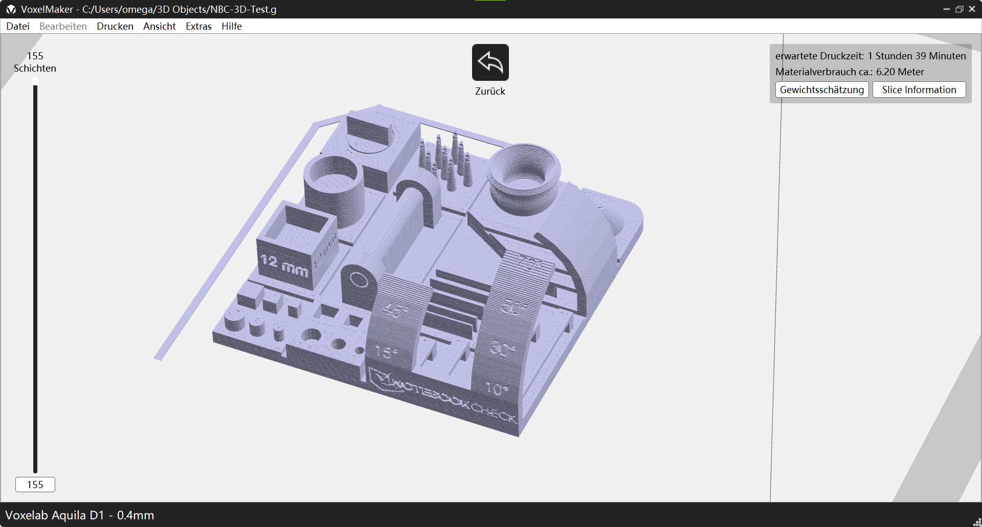 Normalerweise verwenden wir Ultimaker Cura in der neuesten Version, um unsere Testdrucke vorzubereiten. Da der Hersteller jedoch mit dem Voxelmaker einen eigenen Slicer zur Verfügung stellt, haben wir uns entschieden, diesen zu verwenden. Leider zeigt das Ergebnis eine ganze Reihe von Problemen, die hier größtenteils auf eine fehlende Optimierung der Druckeinstellungen zurückzuführen sind. An erster Stelle ist wohl das Rückzugsverhalten (Retractions) zu nennen, bevor der Druckkopf über leere Bereiche des Druckobjektes fahren muss. So stellen wir an mehreren Stellen übermäßiges Stringing und Blobs fest. Das sind Fäden und Filamentreste, die durch bessere Einstellungen fast vollständig vermieden werden könnten. Dies führt auch zu Problemen am Anfang der Linien, da die Un-Retraction-Moves ebenfalls nicht ganz stimmig sind. Auffällig ist auch, dass die Einstellungen für das Solide Infill, also die Deckschichten im Slicer, nicht passen. Dadurch lösen sich diese Bereiche teilweise von den Seitenwänden ab. Beide Probleme können von erfahrenen Anwendern durch kleine Anpassungen behoben werden. Unser graues PLA-Filament von Anycubic haben wir im Ultimaker-Cura-Slicer nahezu perfekt eingestellt. Im Voxelmaker haben wir die Standardeinstellungen für PLA verwendet. Damit hat der 3D-Drucker auch in diesem Bereich einen kleinen Nachteil gegenüber seinen Konkurrenten.