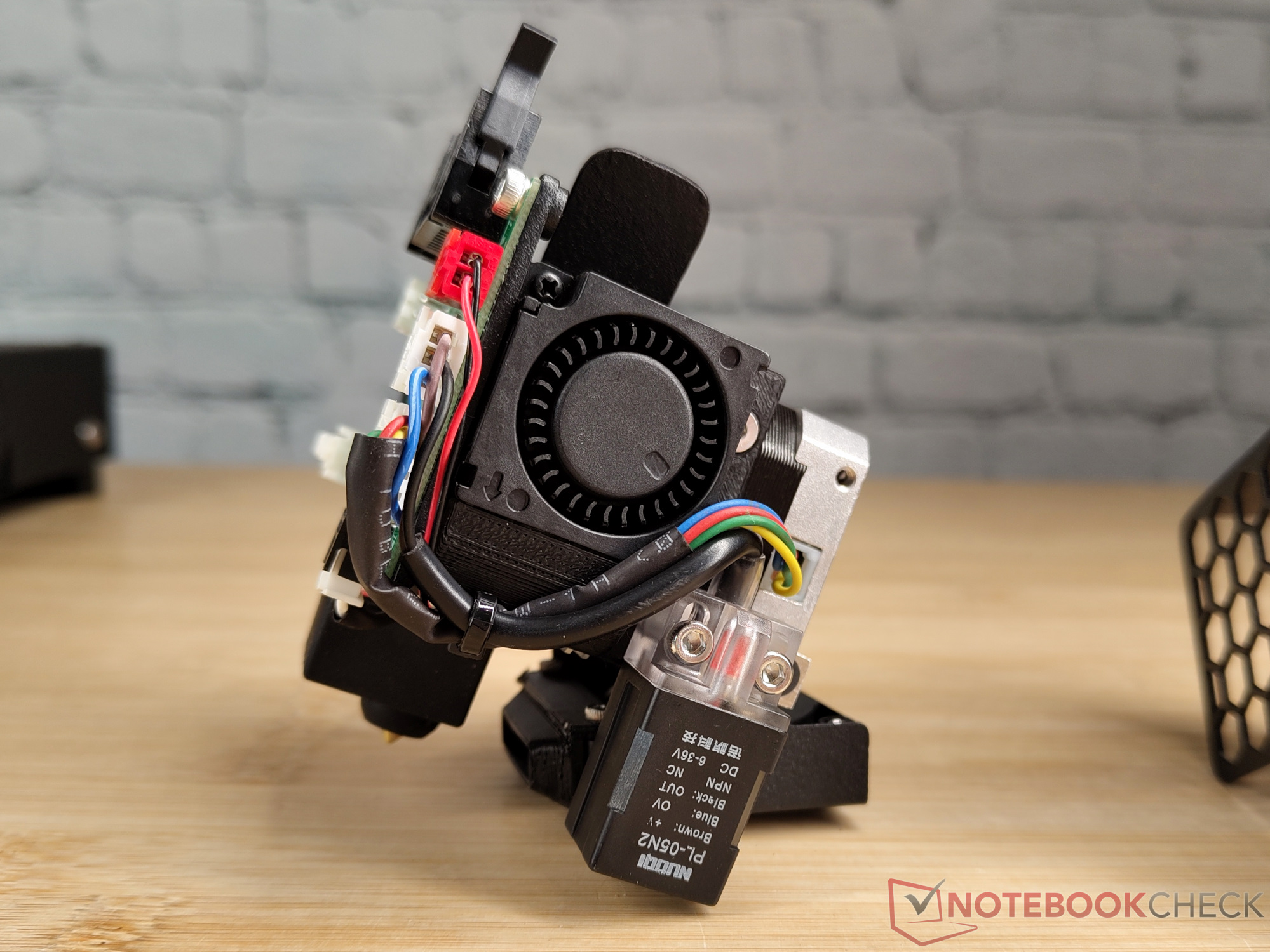 Beim Druckbett scheint es sich hier um das gleiche Standard-Bauteil zu handeln, welches wir zuletzt auch beim Anycubic Kobra 2 gesehen haben. Eine ca. 2 mm dicke Aluminiumplatte bildet hier die Basis. Diese ist von der Unterseite her beheizbar. An der Oberseite ist eine Magnetfolie fast vollflächig verklebt. Darauf haftet die PEI-beschichtete Federstahlplatte. Ohne Isolierung von der Unterseite muss die 24-V-Heizung hier dauerhaft Energie nachführen und benötigt etwas länger zum Aufheizen. Sollte man sich dazu entschließen, eine entsprechende Dämmplatte zu verbauen, dürfte dies neben den Vorteilen beim Energiesparen auch für eine bessere Beweglichkeit des Druckbetts sorgen, da so die Druckbettaufnahme weniger stark erhitzt wird.