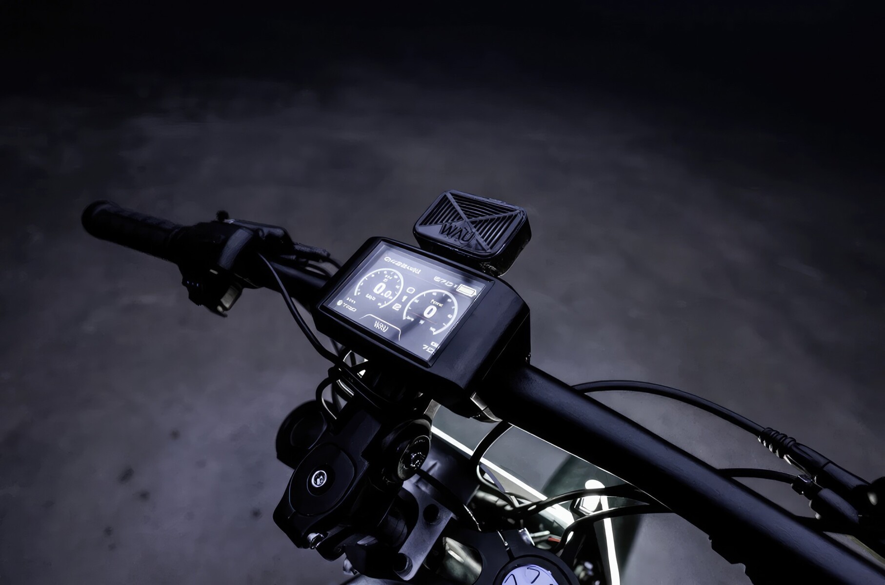 Das WAU Cyber erinnert auf den ersten Blick an den Tesla Cybertruck, besitzt durch den markanten Rahmen und die RGB-LED-Beleuchtung aber einen einzigartigen Look. Die Beleuchtung soll nicht nur schick aussehen, sondern auch nützlich sein, denn die länglichen LED-Streifen dienen als Blinker. Ein LCD in der Mitte der Lenkstange zeigt die aktuelle Geschwindigkeit und den Ladezustand des Akkus an, eine Navi-App gibts aber nur gegen Aufpreis.