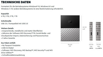 Für die 1-TB-HDD nennt WDC Abmessungen von 110 x 81,5 x 13,5 Millimetern und ein Gewicht von 140 Gramm. Die Varianten der portablen My Passport Ultra mit Kapazitäten von 2, 3 oder 4 TB benötigen hingegen eine Bauhöhe von 21,5 Millimetern und bringen mit 250 Gramm auch etwas mehr Gewicht auf die Waage. Als Schnittstelle dient USB 3.0, ein passendes USB-3.0-Kabel gehört zum Lieferumfang der mobilen Festplatte dazu.
