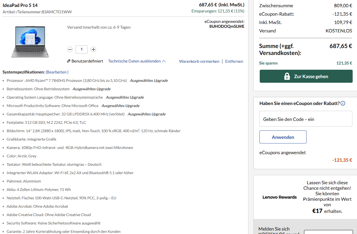 Der Preis kommt dank mehrfachem Rabatt inklusive eines individuellen Gutschein-Codes zustande. Den 15%-Coupon erhält man oftmals nach wenigen Minuten Wartezeit als Pop-up auf der Angebotsseite. Sollte dies jedoch mal nicht klappen, steht einem immerhin jederzeit der Newsletter-Gutschein über 10% auf die erste Bestellung zur Verfügung.