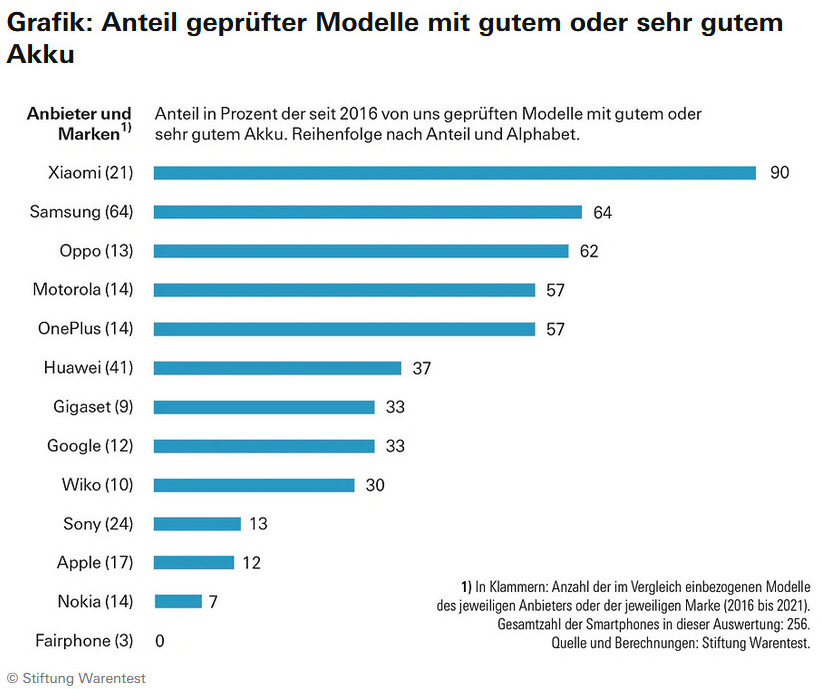 Das Akku-Ranking bei Warentest sorgt für zwei Überraschungen. Zum einen sind "gute" oder "sehr gute" Akkus die Paradedisziplin der chinesischen Kultmarke Xiaomi. Zum anderen landet Apple mit den iPhone-Modellen weit unten im Ranking. Xiaomi hatte bisher die akkustärksten Smartphones bei Warentest am Start, mit respektablem Abstand folgen Samsung (2) und Oppo (3). Hinter Apple und den iPhones und damit am Ende des Rankings landen bei der Akkuausdauer die Handys von Nokia und Fairphone.