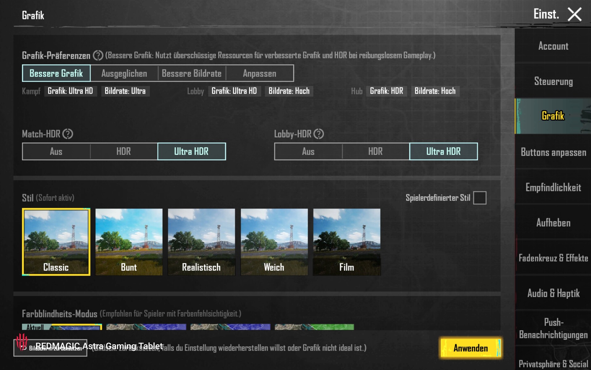 PUBG Mobile läuft auf dem Astra mit den Grafikeinstellungen Ultra HD und der Bildrate Ultra flüssig. Die hohe Leistung des Systems sorgt für Hitze, die abtransportiert werden muss, um Schäden am Gerät und Throttling - Drosselung der Komponenten - zu vermeiden.
