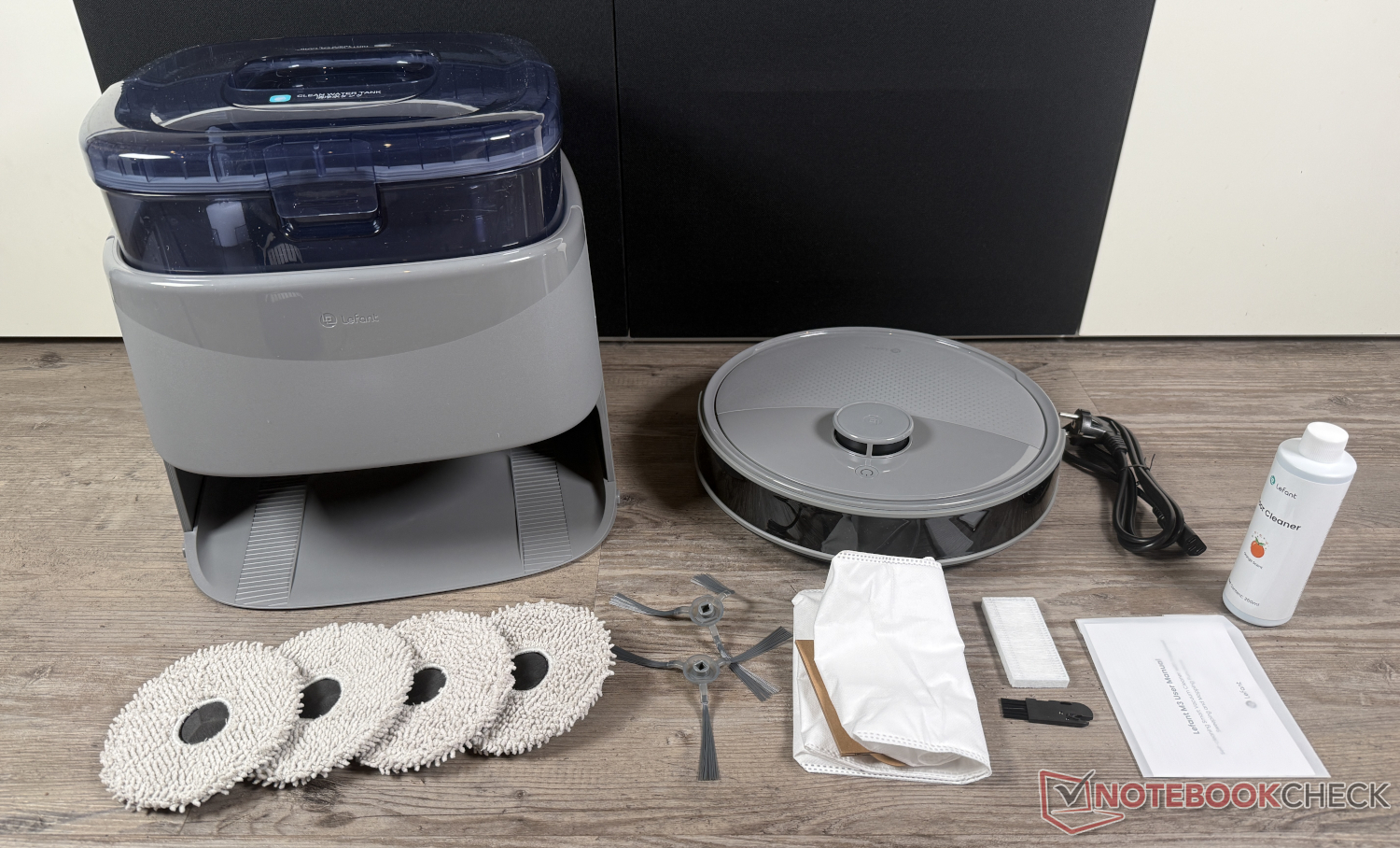 Lefant legt im Lieferumfang eine kleine Flasche Reinigungsmittel bei. Die muss aber manuell in den gut 3 l fassenden Frischwassertank gegeben werden. Eine automatische Reinigungsmitteldosierung ist für diesen Preis aber auch nicht erwartbar. Zudem liegen je ein Ersatzstaubbeutel, zwei zusätzliche Wischmopps und eine zweite Seitenbürste neben der obligatorischen Kurzanleitung bei.