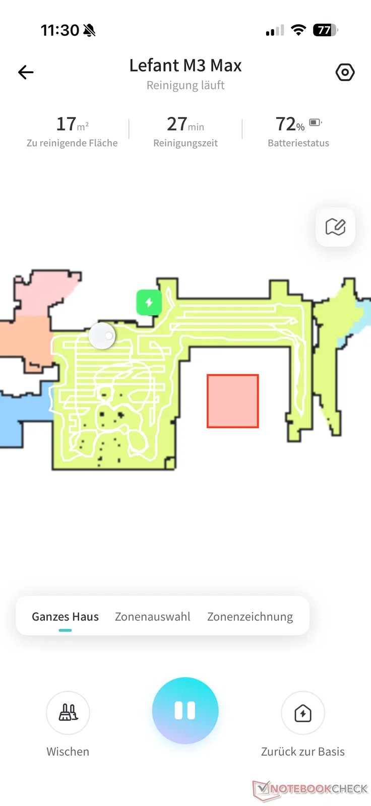 Nach der Reinigung von ca. 50 Quadratmetern mit der dritten Saugstufe (von vier) und 10-Minuten-Intervallen beim Wischen ist der Lefant M3 Max im Test mit rund 30 Prozent Restladung im Akku zurück zur Station gekehrt. Somit ist die Reinigungsfläche pro Akkuladung bei diesen Einstellungen auf gut 60 Quadratmeter begrenzt. Wird die Leistung heruntergeschraubt, ist mehr Fläche pro Akkuladung möglich. Dann leidet aber natürlich auch die Reinigungsleistung.