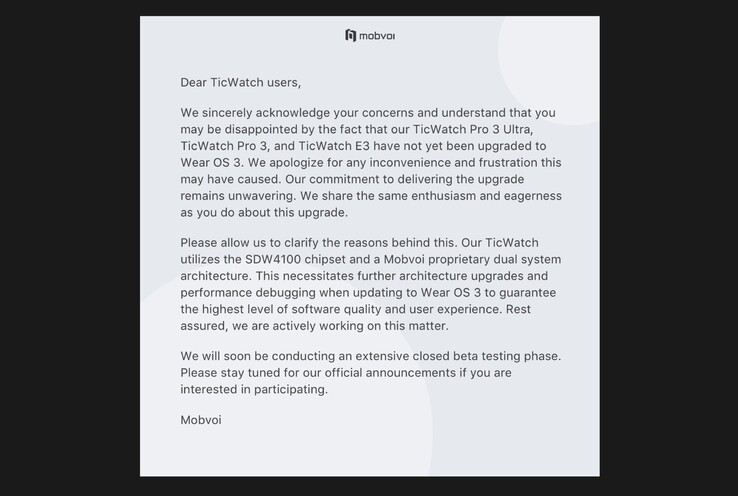 Nun hat sich der Konzern öffentlich zu dieser Situation geäußert, und das unten eingebettete Statement auf Twitter veröffentlicht. Das Statement enthält eine kurze Entschuldigung und eine Versicherung, dass die drei Smartwatches das Update noch erhalten werden. Als Grund für die Verzögerung gibt Mobvoi an, dass es mehr Aufwand erfordern würde, Wear OS 3 für die hauseigenen Smartwatches zu optimieren, da die Uhren nicht nur mit dem Qualcomm Snapdragon Wear 4100 ausgestattet sind, sondern zusätzlich einen sparsamen Co-Prozessor besitzen, um eine längere Akkulaufzeit zu erzielen.