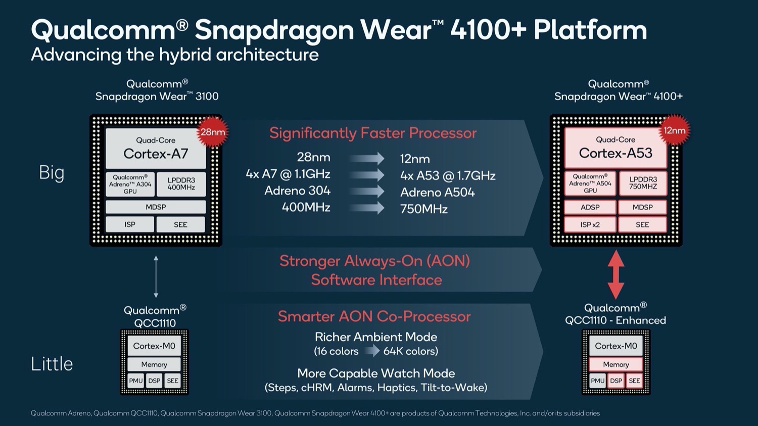 Ende Juni 2020 hat Qualcomm endlich zwei neue SoCs eingeführt, welche die Konkurrenz übertreffen sollten. Abgesehen vom sparsamen QCC1110-Co-Prozessor sind der Snapdragon Wear 4100 und der Snapdragon Wear 4100+ praktisch identisch, laut Hersteller bietet der Chip eine 85 Prozent bessere CPU- und Speicher-Performance und die 2,5-fache Grafikleistung seines Vorgängers. Der Stromverbrauch sollte um 25 Prozent sinken, das Always-on-Display erhält dagegen neue Features, wie etwa die Möglichkeit, 64.000 Farben darzustellen, statt zuvor nur 16.